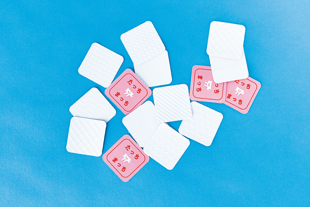 さわり心地の説明役と、見つける役に分かれて、たくさんの触覚クッションの中から、同じ触覚の2つを見つけよう。正解したら+1点、間違えてしまったら-1点。