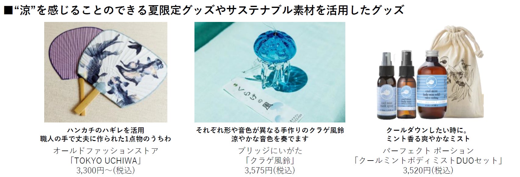 日本橋エリアの約170店舗が、夏にぴったりの涼しげな限定メニューを展開します。見た目も爽やかな金魚鉢をイメージした「金魚ゼリー」や、だし香るジュレで夏でも楽しめる「冷やしおでん」など、見ても涼しい、味わっても涼しいメニューが揃いました。また、今年はハンカチの端切れを職人の手で再利用して制作したうちわなど、サステナブルな素材を活用したグッズも展開。日本橋らしい“ECO”なこだわりの一品をお楽しみください。