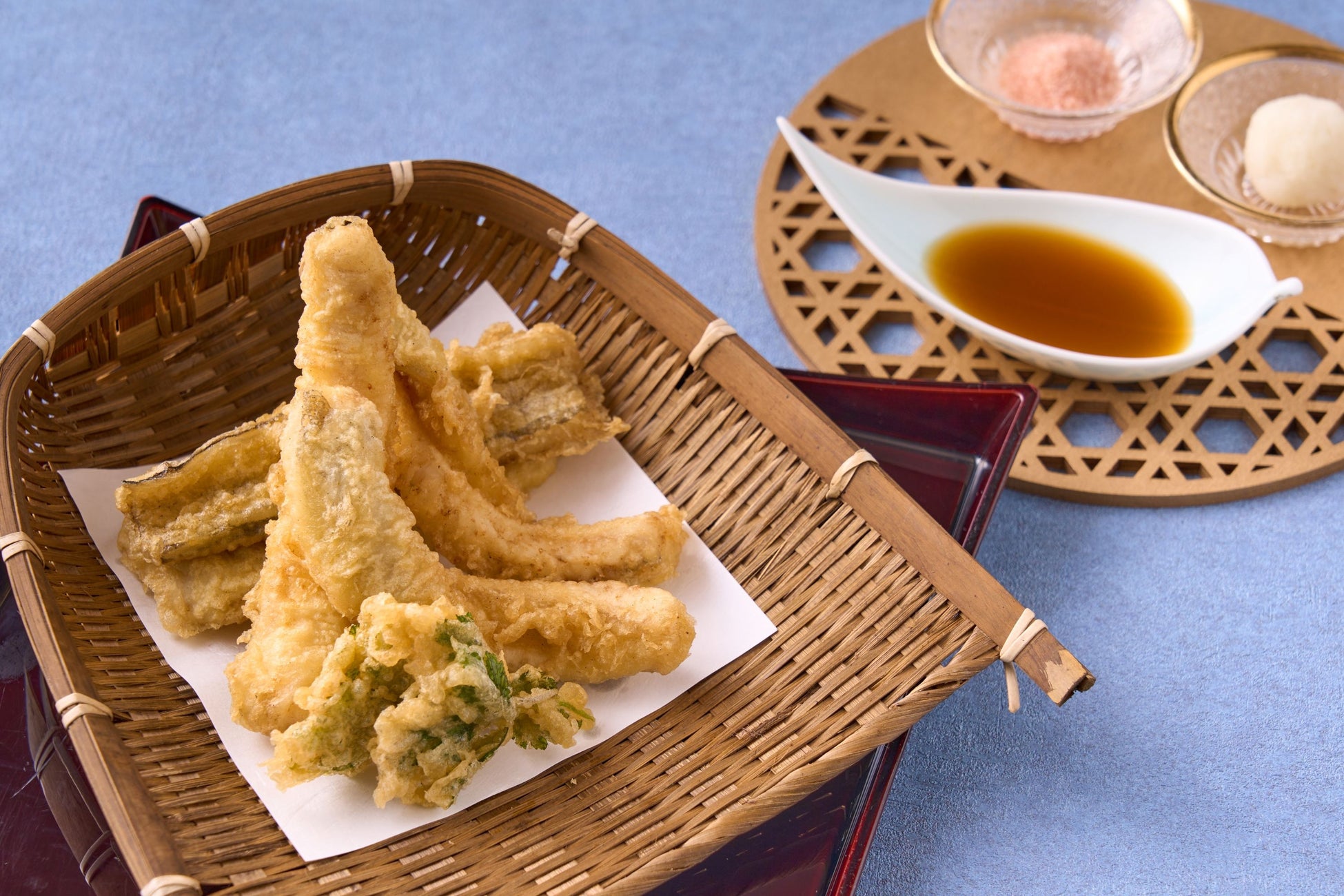 県下有数の水揚げ量を誇る鐘崎漁港(*1)で水揚げされる天然穴子の天ぷらを提供するのは「メルキュール福岡宗像リゾート&スパ」。年に2回、6~8月と10~12月に旬を迎えますが、夏の穴子は脂が少なく淡泊でさっぱりとした味わいが特徴です。天つゆや塩など、お好みの味付けでご堪能ください。ビュッフェならではの楽しみ方としてご飯に盛り付け天つゆをかければ、穴子天丼としてもお楽しみいただけます。