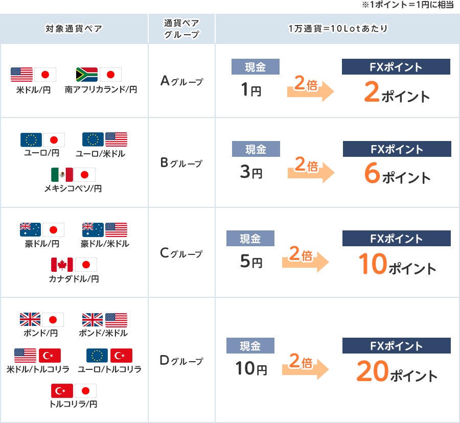 対象期間中の『外貨ネクストネオ』における指定通貨ペアの新規注文の取引量に応じて、最大200万円相当のFXポイント、もしくは現金100万円のキャッシュバックをいたします。