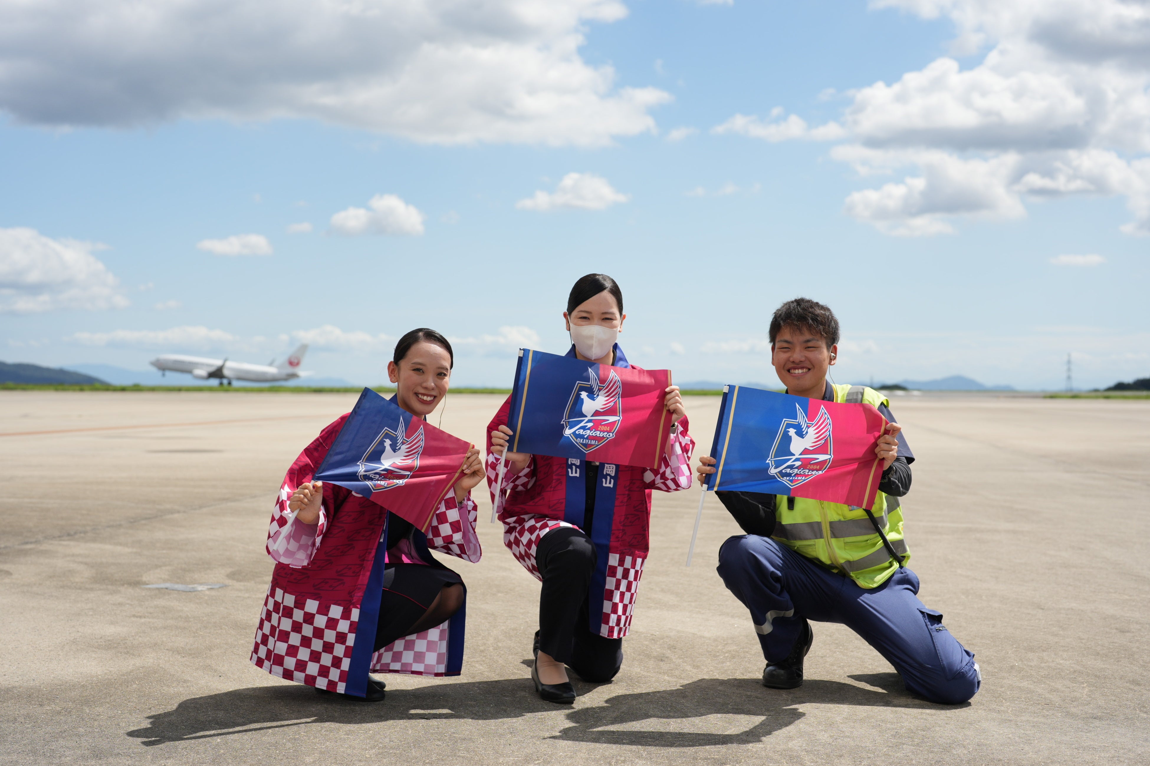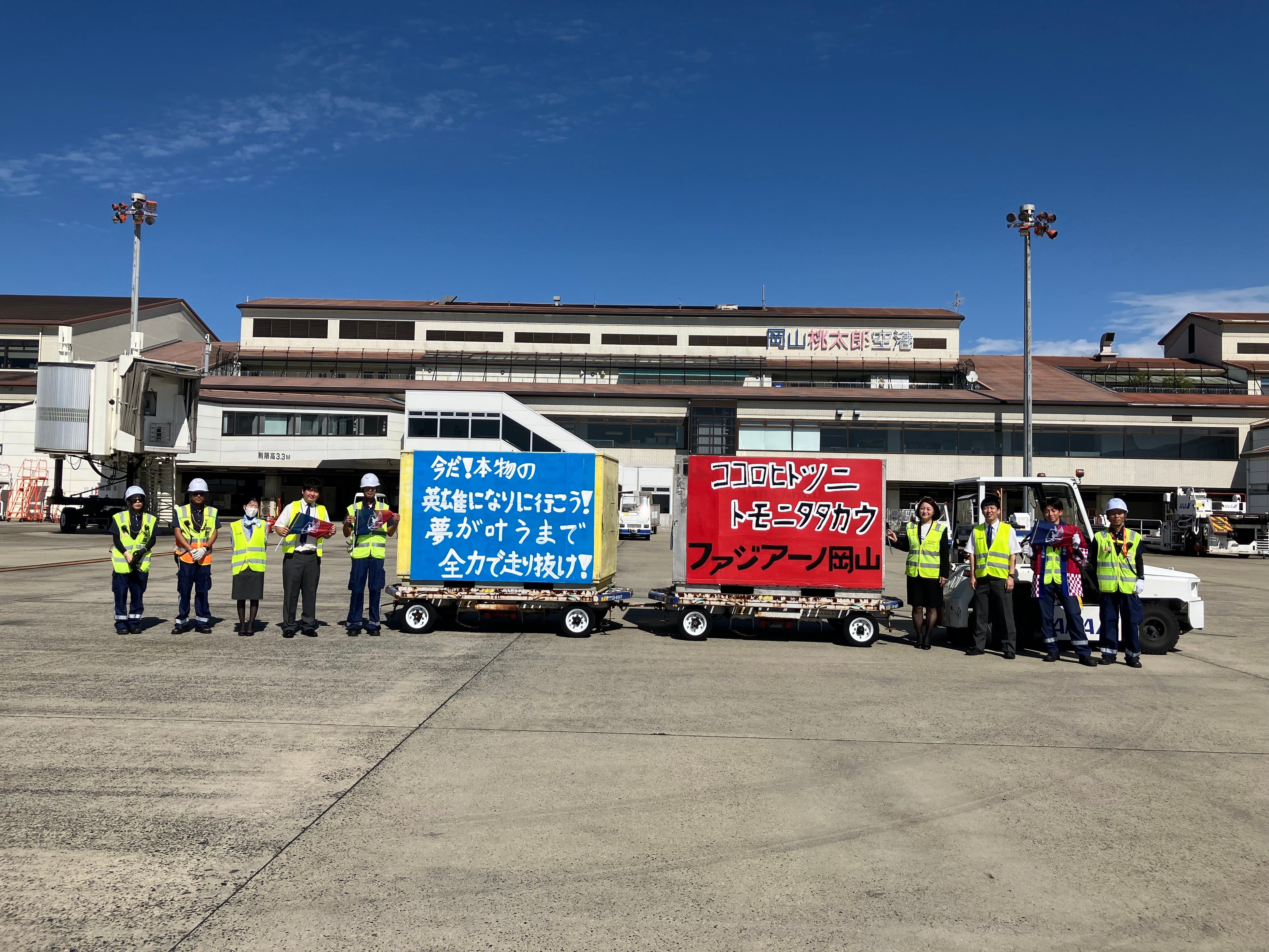 Jリーグもいよいよ後半戦。J1初挑戦のファジアーノ岡山は、毎試合で岡山のサポーターに感動を届けています。 両備グループでは「両備ファジアーノ全力応援プロジェクト」として、さまざまな応援企画を展開していますが、このたび、岡山桃太郎空港の地上業務全般を担う両備ホールディングス株式会社両備スカイサービスカンパニー(所在地:岡山市北区日応寺、カンパ ニー長:槙尾恵)の企画で、関東圏で開催されるアウェイ戦を対象に、観戦にでかけるサポーターを岡山の空の玄関口である岡山桃太郎空港からお見送りしよう!というプロジェクトを進めていますのでお知らせします。ANA、JALの航空会社の協力をいただき実施が実現したもので、”岡山らしいおもてなし”を尽くしてまいります。