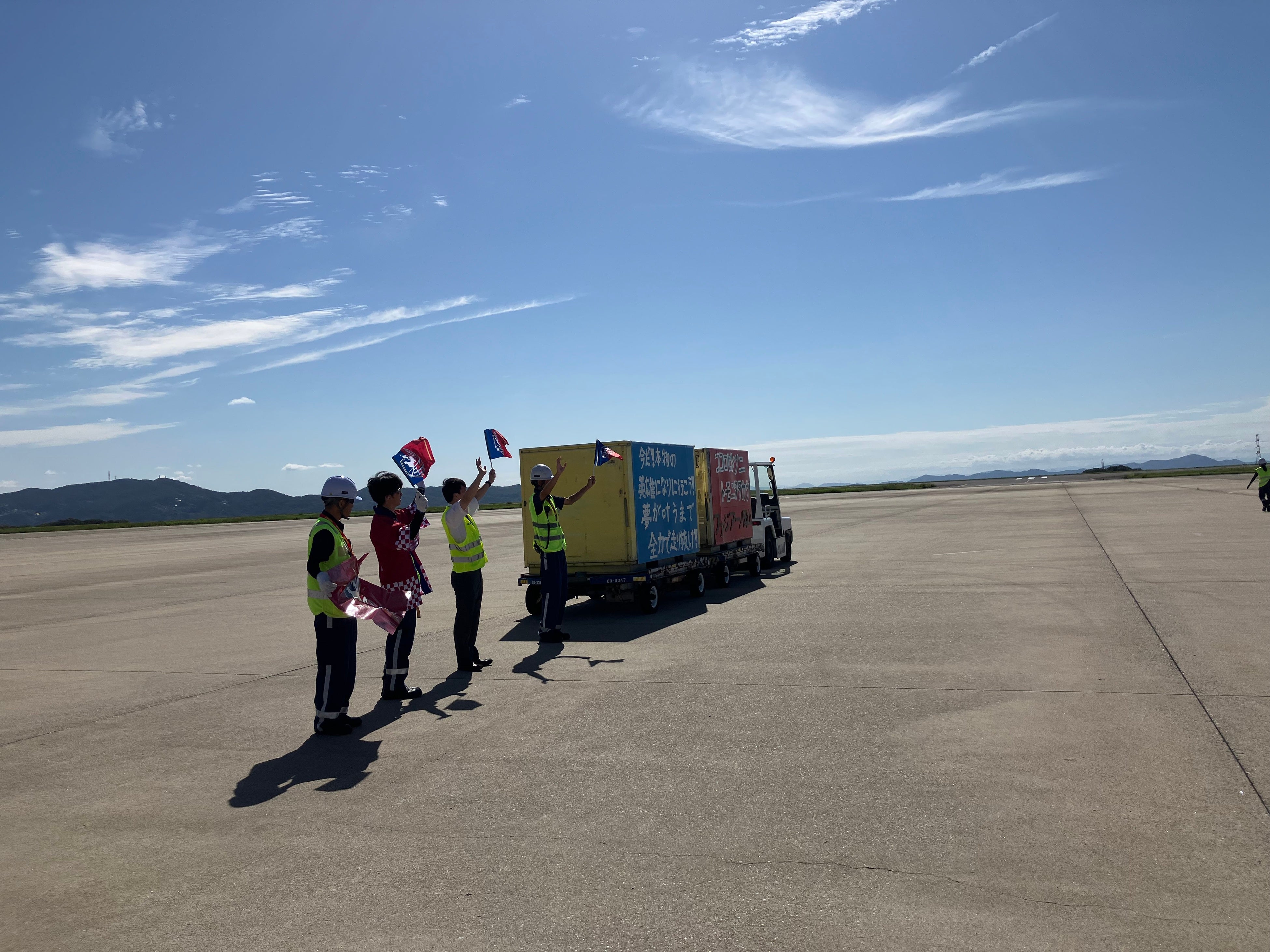 航空機の出発時に空港スタッフがファジアーノ岡山公式フラッグを振ってお見送りします。