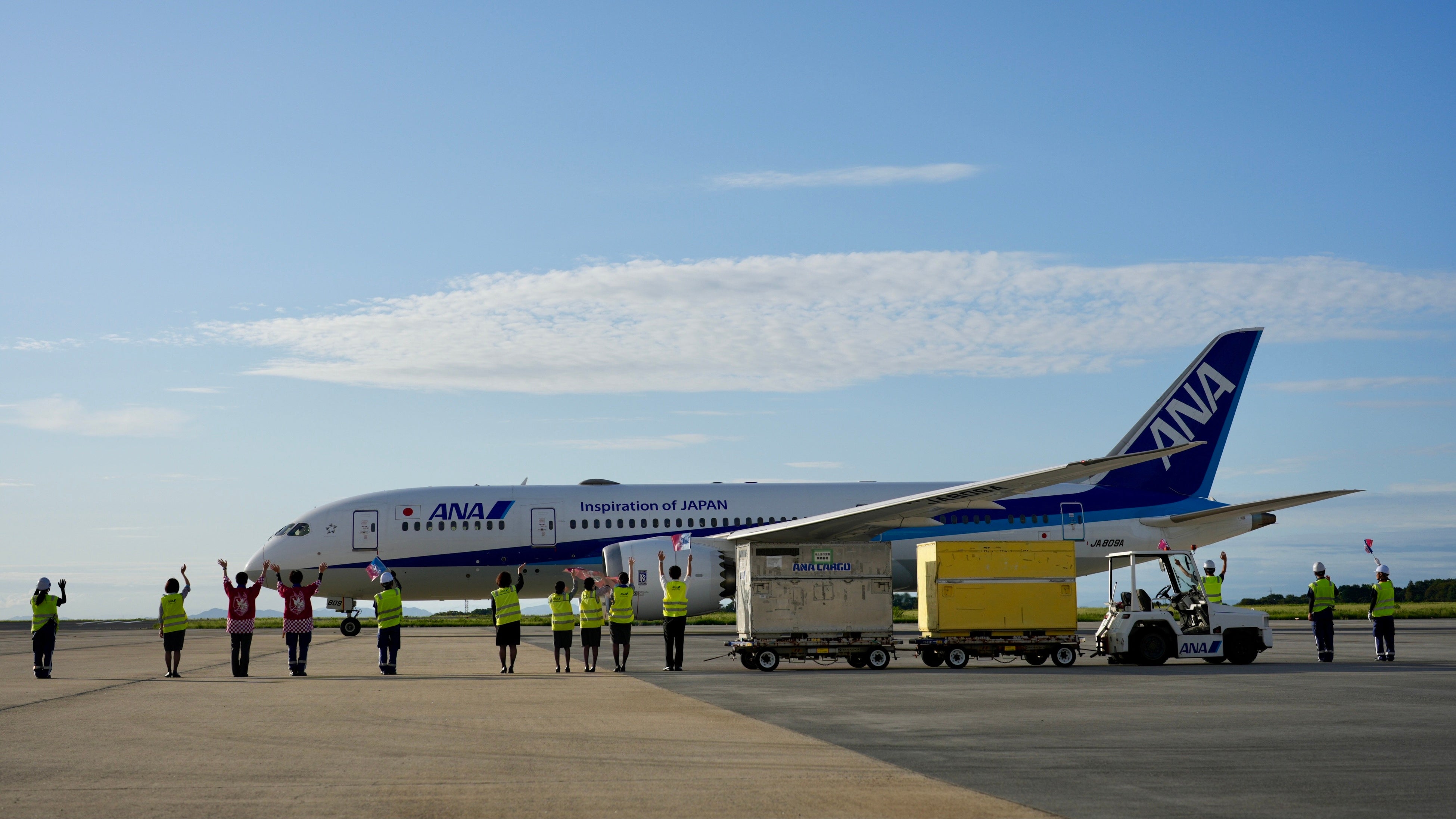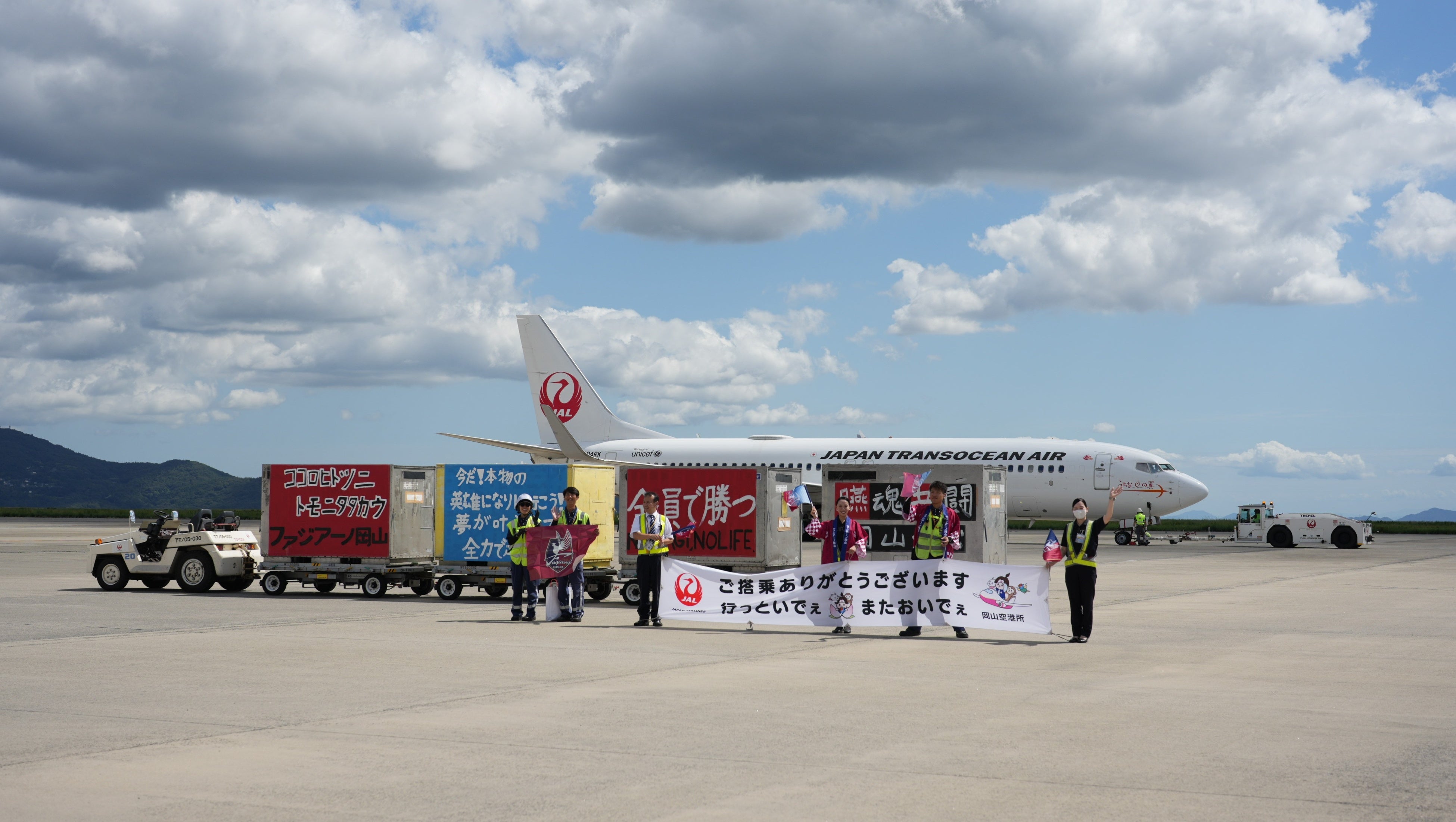 航空機付近にいるグランドハンドリンスタッフがファジアーノ岡山公式法被を着用し、岡山空港出発時点からのワクワク感を演出します。