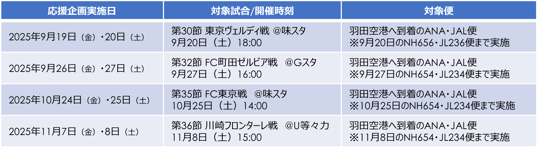 関東圏で開催されるアウェイ戦4ゲーム(9/20東京V戦、9/27町田戦、10/25FC東京戦、11/8川崎F戦)において、試合前日と当日に羽田空港に向けて出発する、岡山空港出発のANA便、JAL便(全58便)を対象に応援企画を実施します。