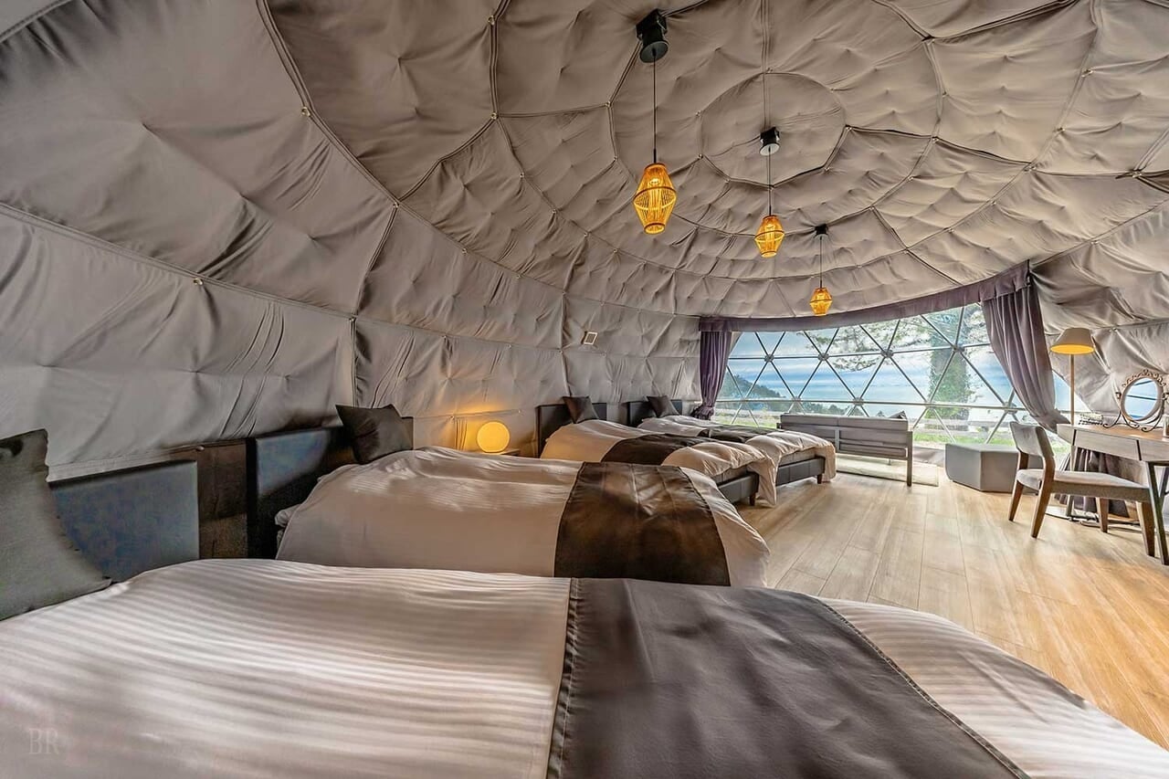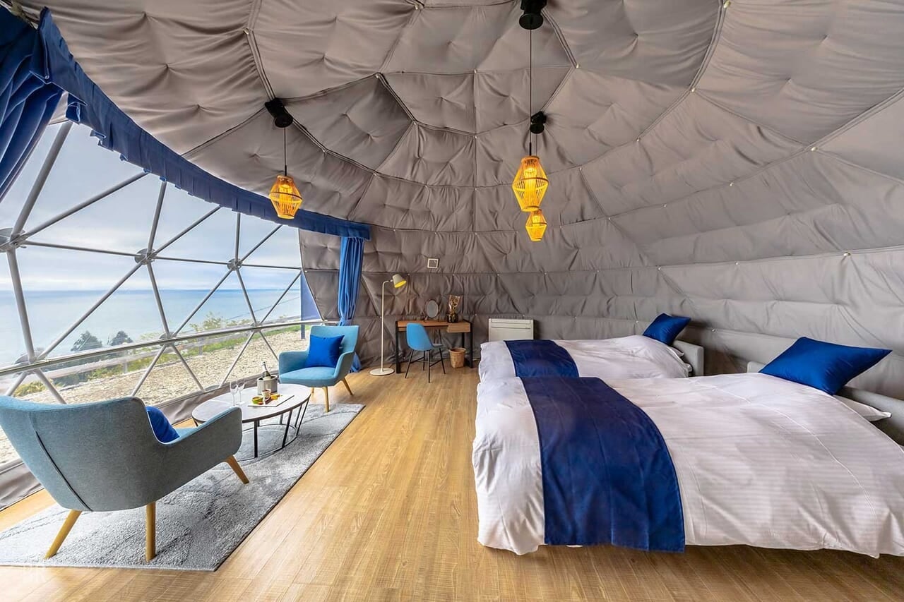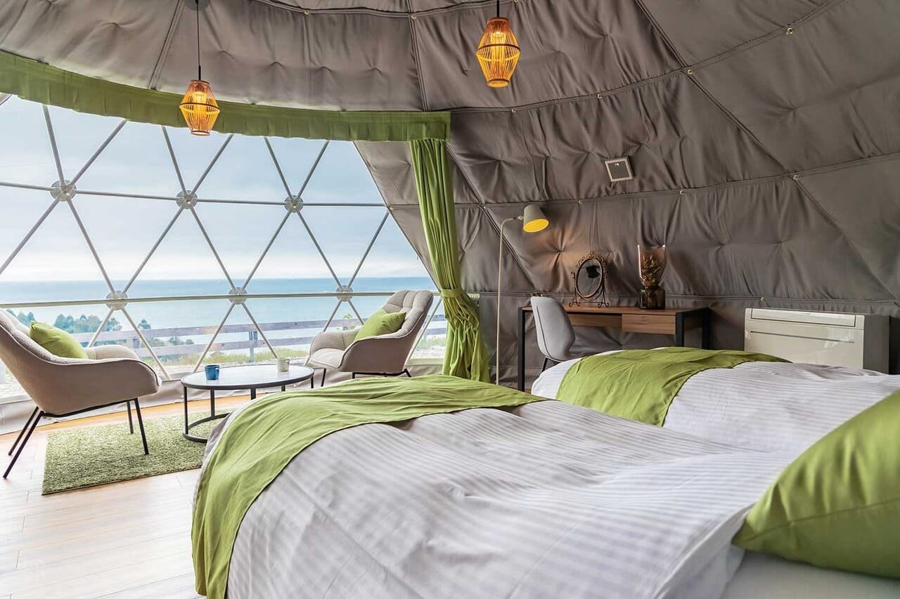 客室は、3名定員のドームが2棟、5名定員のドームが2棟をご用意しており、カップルやご夫婦はもちろん、ご家族やグループでのご利用にも最適です。風が心地よく通り抜けるお部屋からは、空と海が一望でき、贅沢な時間をお楽しみいただけます。