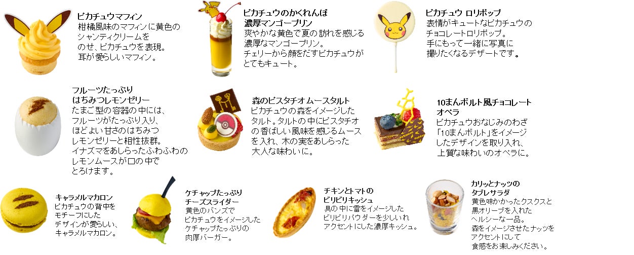 ピカチュウの鮮やかなイエローカラーからインスピレーションを受けたミニバーガーをはじめ、ピカチュウシルエットのマフィン、ピカチュウの背中の模様がデザインされたマカロンなど、遊び心溢れるメニューの数々が楽しげに並びます。