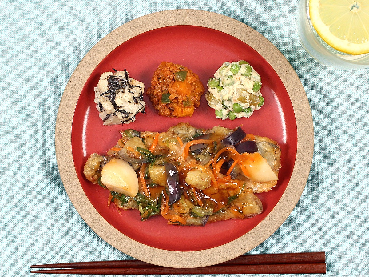 レンジ加熱した際にお酢の香りが強くなりすぎないように、甘みと酸味を絶妙なバランスで仕上げております。副菜はカリフラワーのひじきマヨ、かぼちゃの肉そぼろ、お豆とふきの白和えです。