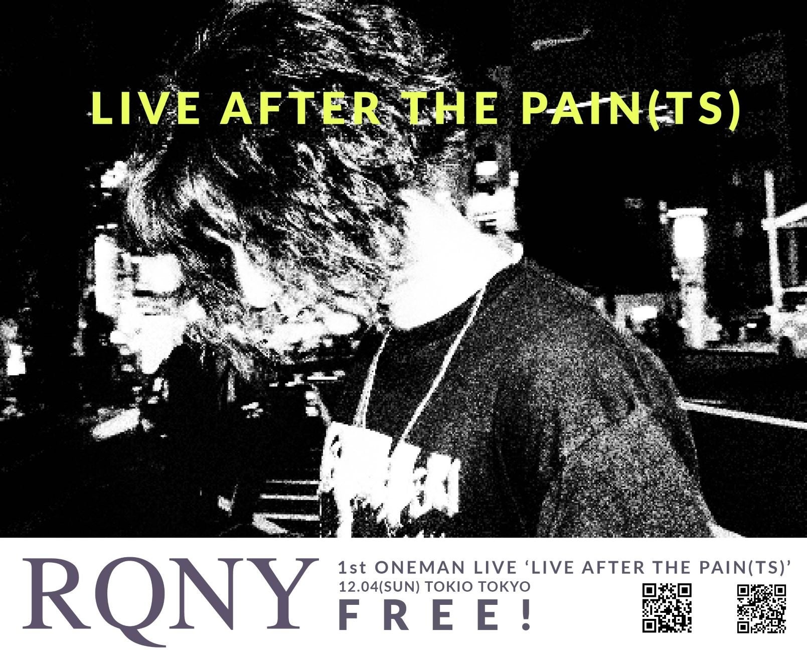 1st EP「pain(ts)」が各所で激賞されているRQNYが、本日開催されたイベント『Invitation to TRIAL GATE SPECIAL!』での迫真のパフォーマンスの直後、初のワンマン・ライブと大阪でのイベント出演を発表した。また、11月28日(月)は、大阪BIG CATで開催されるイベント『KJSK ver,20221128』へ出演。12月4日(日)には、渋谷TOKIO TOKYOにて、なんと初ワンマンにしてチケット代無料のフリー・ライブの開催が決定している。