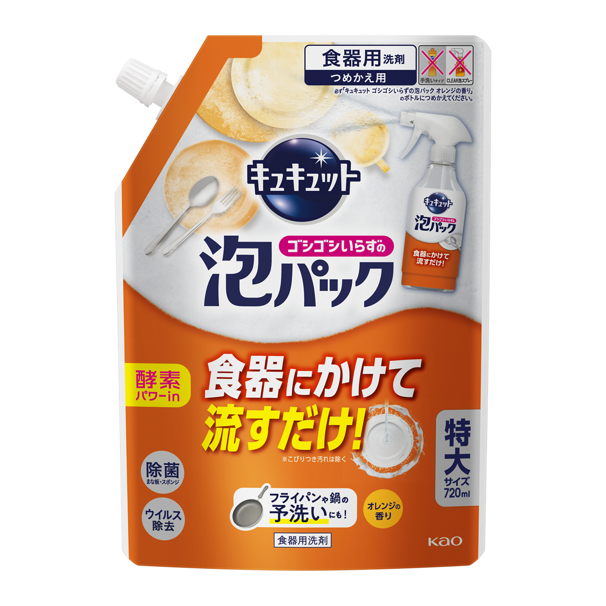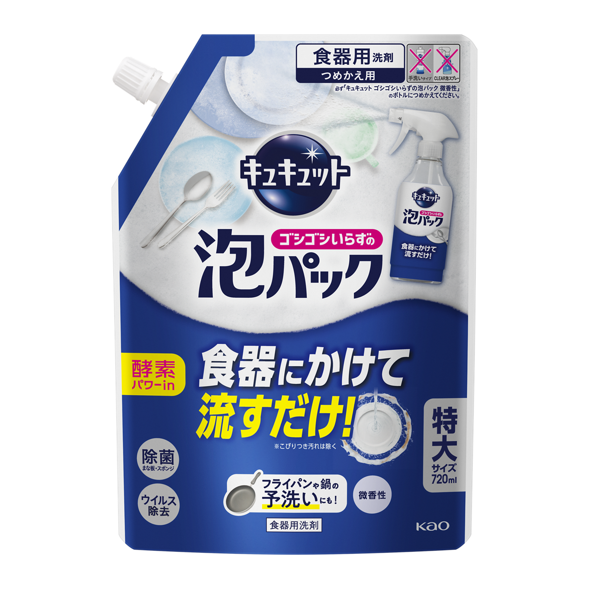 花王株式会社(社長・長谷部佳宏)は、2025年4月5日、食器用洗剤「キュキュット」から、新しい食器洗い習慣*2 を提案する『キュキュット ゴシゴシいらずの泡パック』を発売いたします。高い洗浄力とシンクの食器全体に泡をかけやすいスプレー設計の両立で、“食器にかけて流すだけ*1”で、スポンジでゴシゴシこすることなく汚れを落とせる食器洗いを実現しました。