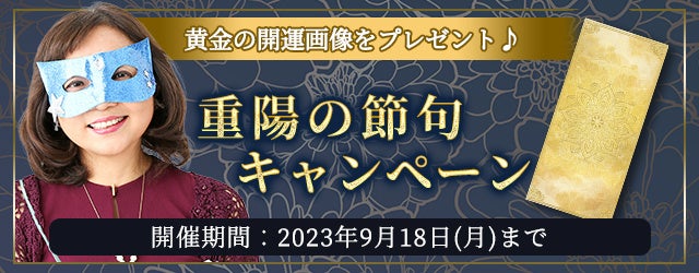 『重陽の節句キャンペーン』では、陰陽五行説で縁起が良いとされる奇数の最大数「9」が重なる重陽の節句にちなんで、あなたの運気を最大限にアップさせる、キャンペーン期間限定の「黄金の開運画像」をご用意いたしました。キャンペーン対象鑑定を占って頂くと開運画像をGETできます。1年の中でも最大の開運チャンスである重陽の節句に、ぜひ「水晶玉子◆エレメンタル占星術」で占いをお楽しみ下さい。