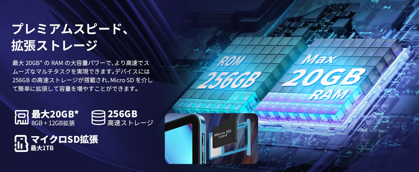 最大20GBのRAM大容量パワーで、より高速でスムーズなマルチタスクを実現できます。デバイスは256GBの高速ストレージが搭載され、Micro SDを介して簡単に拡張して容量を増やすことができます。