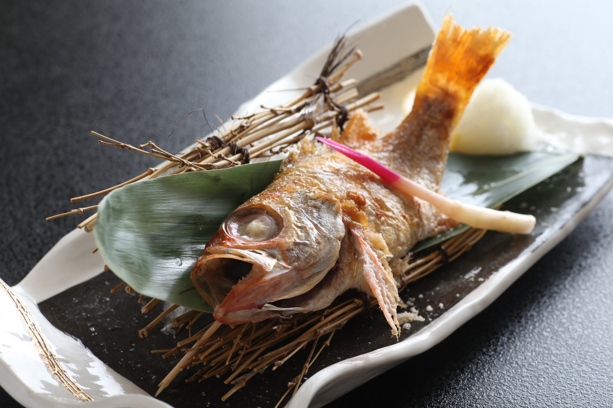 地元でも高級魚の「のどぐろ」を塩焼きでご用意しました。ジュとあふれる脂とトロトロになった身はあっさりとした塩味でお召し上がりください。最高品質の「鳥取和牛」は、脂の旨味と特有の香りがあり、コクと旨味が増す「すき焼き」でご用意。口の中で柔らかく溶け出す甘みとうまみの口福をお楽しみください。また、オープンキッチンなどにも「食のみやこ鳥取県」を代表する季節の食材を使った料理が並びます。