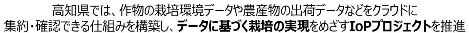 高知県では、施設園芸ブランドや農家所得の向上につなげるべく、ほ場内の栽培環境データや、県全体にわたる農産物個々の出荷データなどをクラウドに集約・確認できる仕組みを構築し、データに基づく栽培(データ駆動型農業)の実現をめざすIoPプロジェクトを推進しています。