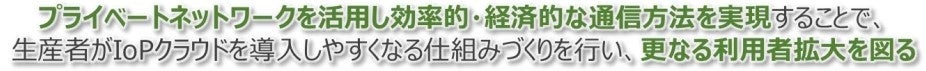 本実証において、プライベートネットワークを有効活用した効率的・経済的な通信方法を実現することで、接続形態や接続機器などの選択肢を増やし、生産者がIoPクラウドを導入しやすくなる仕組みづくりを行い、更なる利用者拡大を図ります。