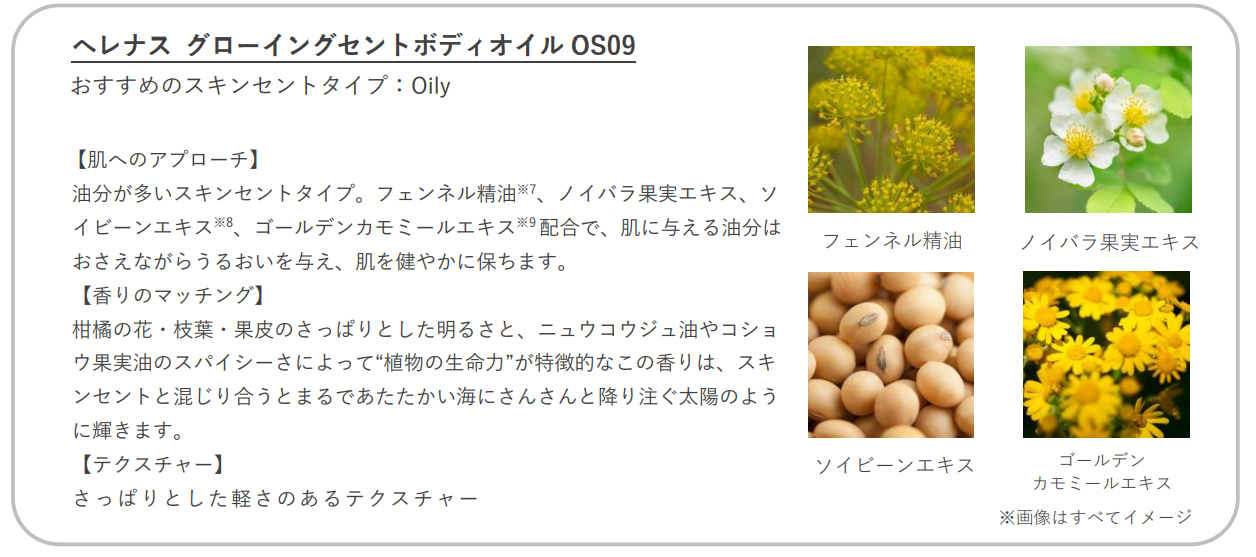 スキンセントタイプごとの水分と油分のバランスに着目。タイプに合わせた肌へのアプローチで、それぞれのスキンセントの魅力を引き出します。さらに特徴に合わせて厳選された精油を配合し、スキンセントの魅力を引き立たせるための“香りのマッチング”で、スキンセントを活かした“自然ないい匂いの人”を叶えるボディオイルです。