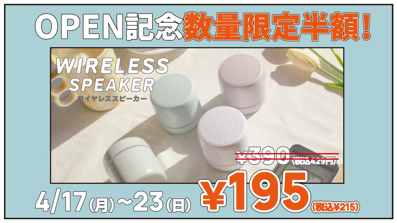 オープンから1週間は、累計販売数14万個以上を売り上げている人気の「ワイヤレススピーカー」を数量限定半額の税抜195円(税込215円)で販売いたします。