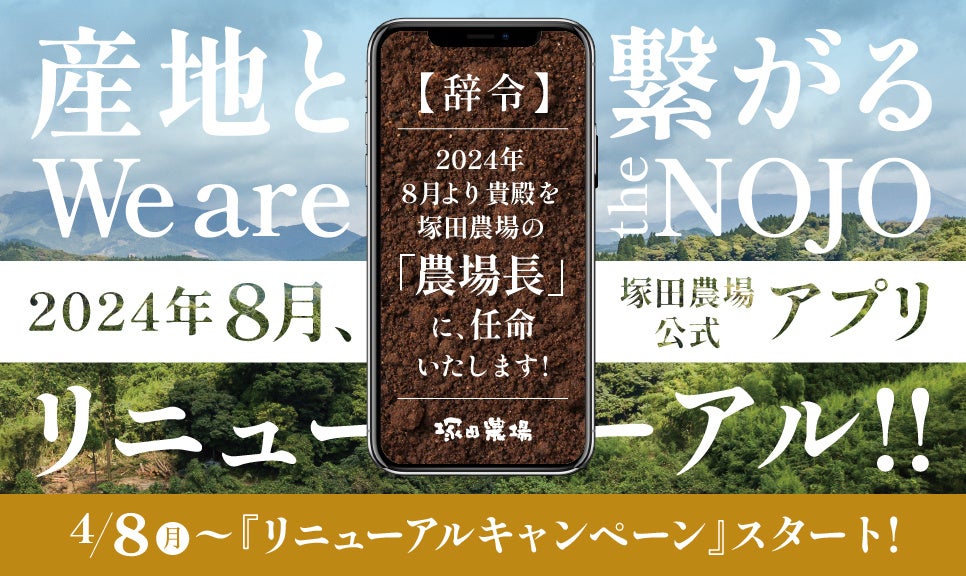 株式会社エー・ピーホールディングス(本社:東京都豊島区、代表取締役会長 兼 社長:米山久)が運営する「宮崎県日南市 塚田農場」、「宮崎県日向市 塚田農場」、「鹿児島県霧島市 塚田農場」、「北海道シントク町 塚田農場」、および「炭火焼鳥 塚田農場」は、2024年8月に公式アプリを全面リニューアル予定です。