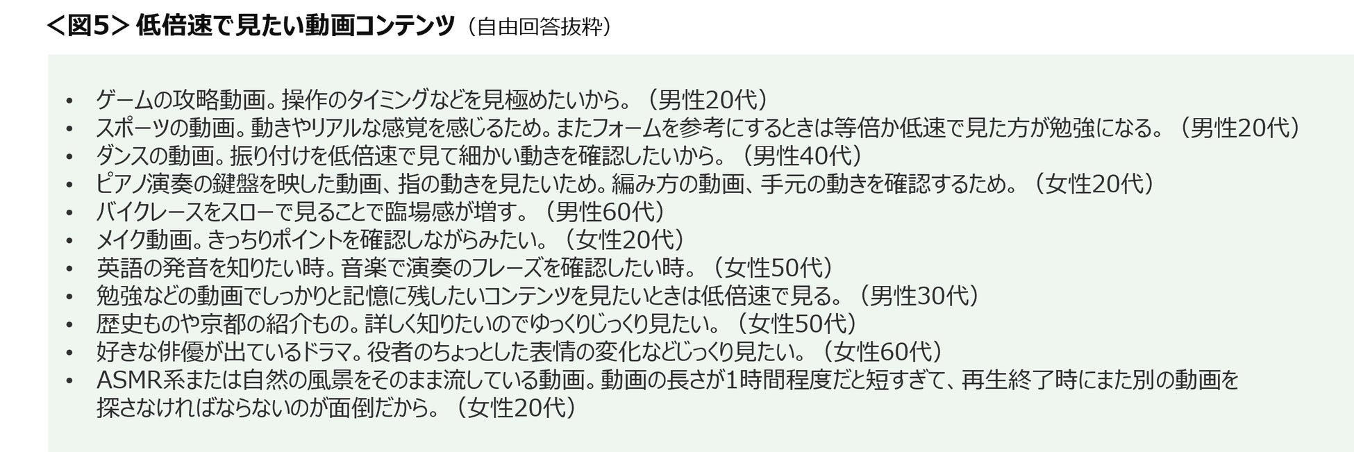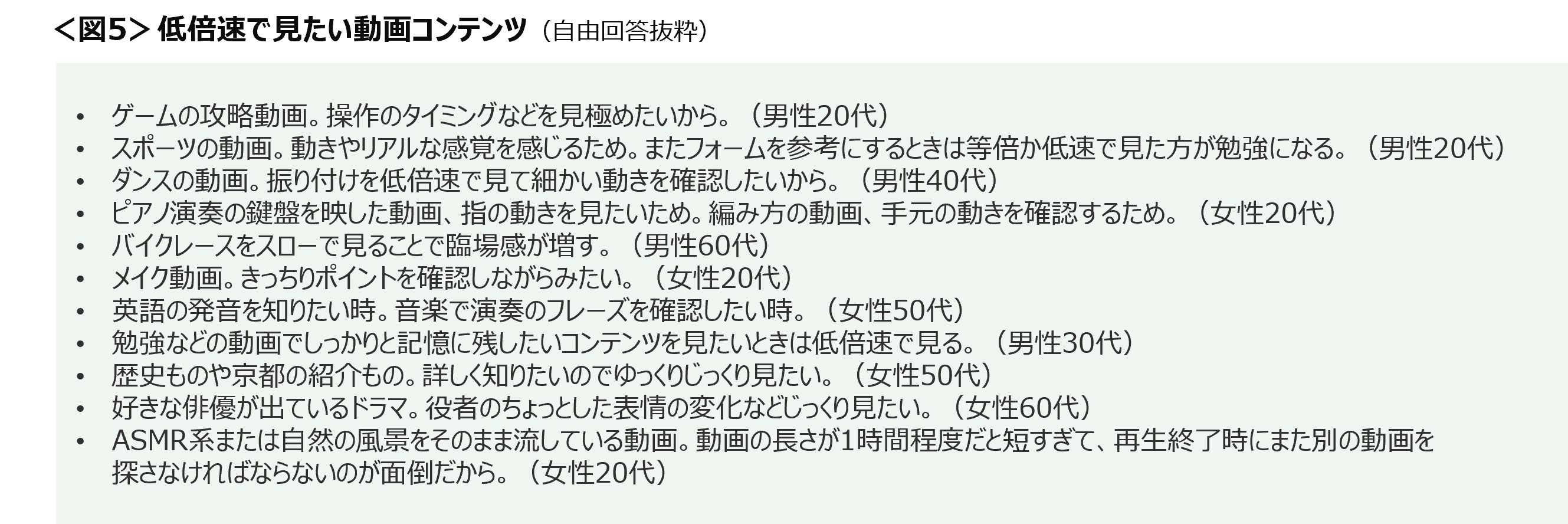 低倍速で視聴したい動画は、「スポーツ」「ダンス」「ピアノ」「メイク」「英語」など習得を目的としたものや、やり方を確認したり、記憶に残したいコンテンツがあげられた。<図5>