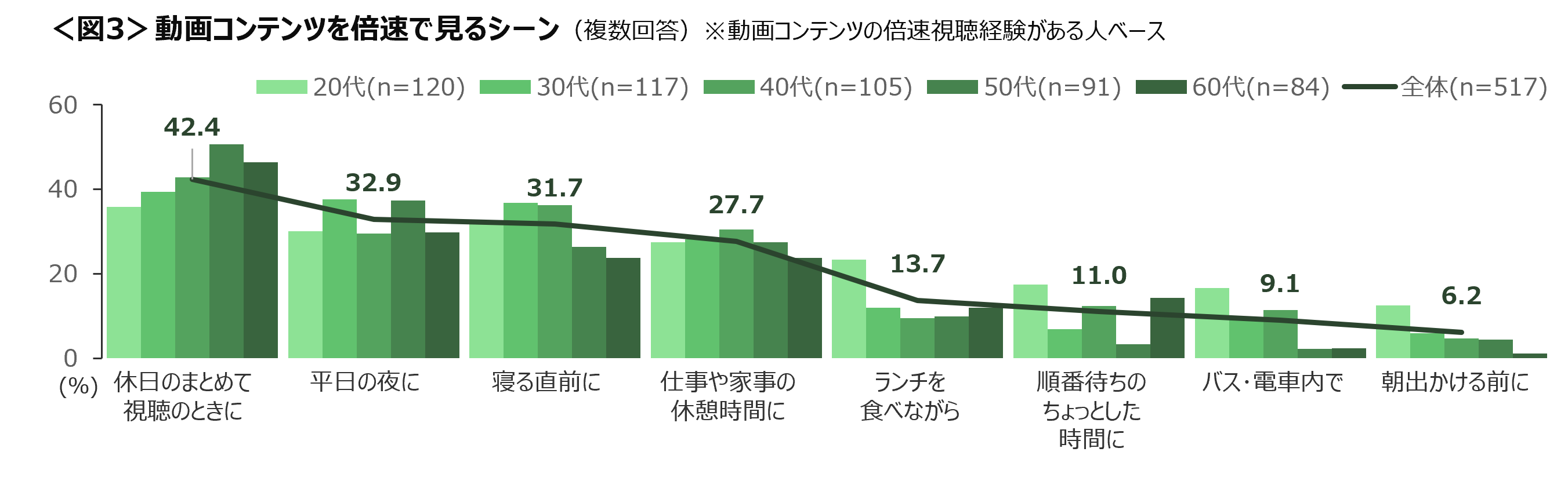 倍速で視聴するシーンは、「休日にまとめて」が4割。次いで「平日の夜」「寝る直前」が3割と続く。