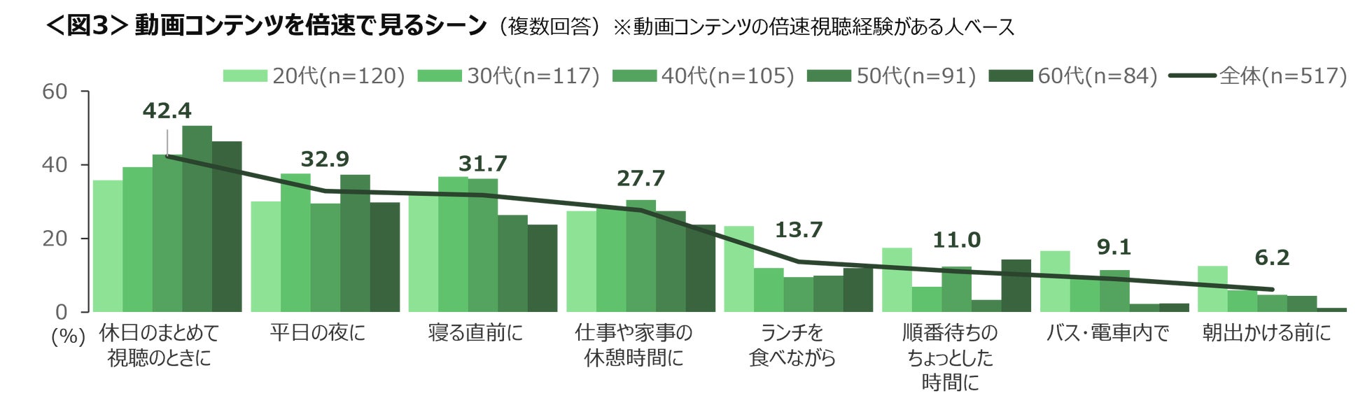 20代は「ランチを食べながら」「順番待ちの時間」「バス・電車内」など、ちょっとした空き時間に倍速で視聴している。<図3>