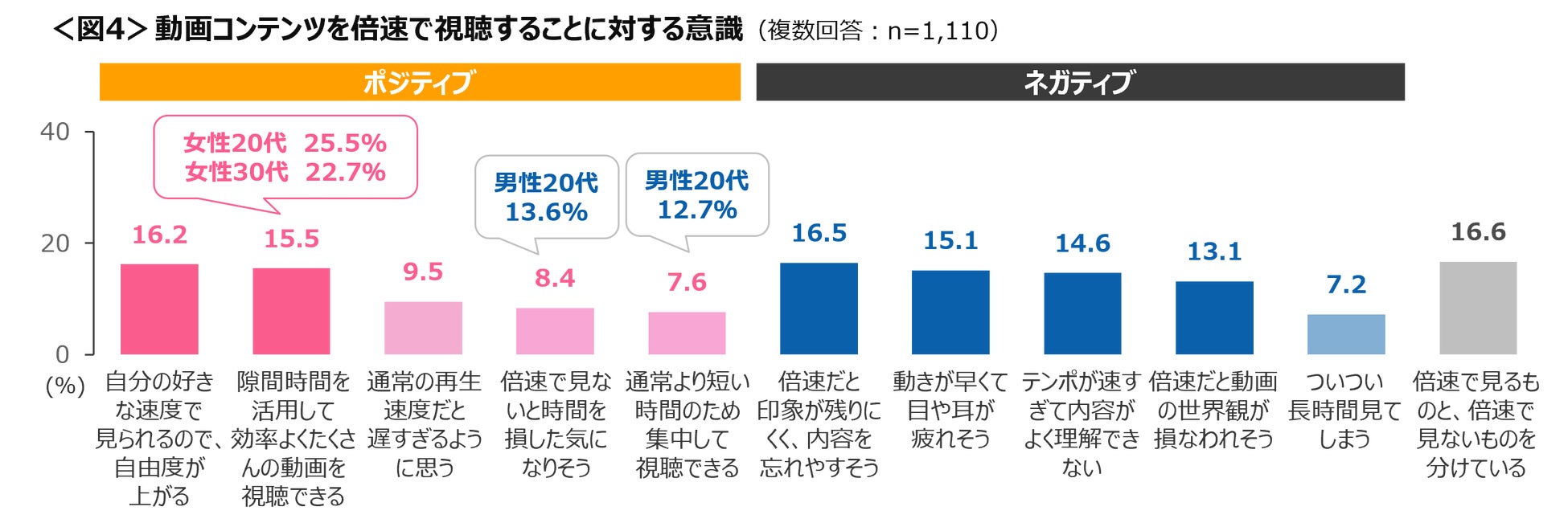 女性20代・30代では「効率よくたくさんの動画を視聴できる」、男性20代では「倍速で見ないと時間を損した気になりそう」「集中して視聴できる」が高く、若い世代では特に時間効率を意識している様子。<図4>