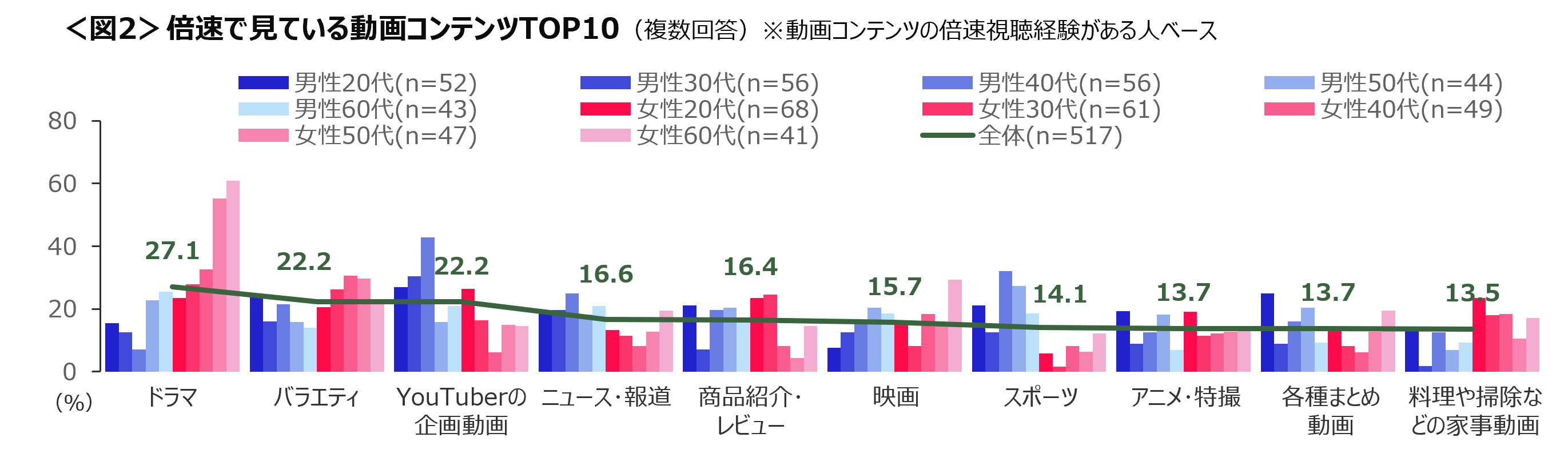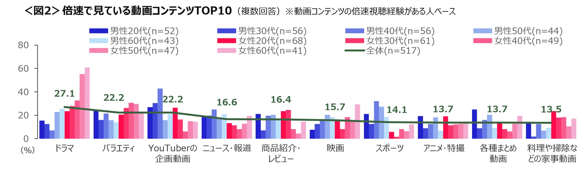 倍速で視聴している動画コンテンツは、「ドラマ」「バラエティ」「企画動画」が上位。「ニュース・報道」「商品紹介、まとめ動画」「映画」などのジャンルも倍速でよく視聴されている。<図2>