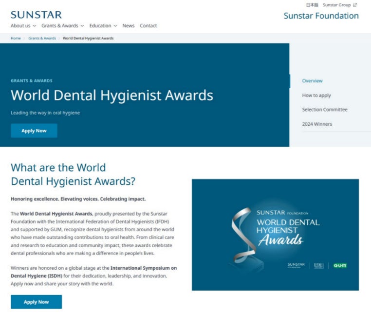 世界歯科衛生士賞は、歯科衛生学や患者、地域社会、一般社会に優れた貢献をした歯科衛生士を称える目的で2004年に創設し、サンスターとは独立した専門家から成る選考委員会の厳正な審査により選出された歯科衛生士を表彰してきました。今回で7回目を迎える本賞では、世界中の歯科衛生士の中から、一般社会および歯科業界に貢献された方々を対象に、公衆衛生部門や臨床部門など全6部門で募集しています。各部門の受賞者は、2026年7月にイタリア・ミラノで開催される「International Symposium on Dental Hygiene(ISDH)」の授賞式にご招待します。