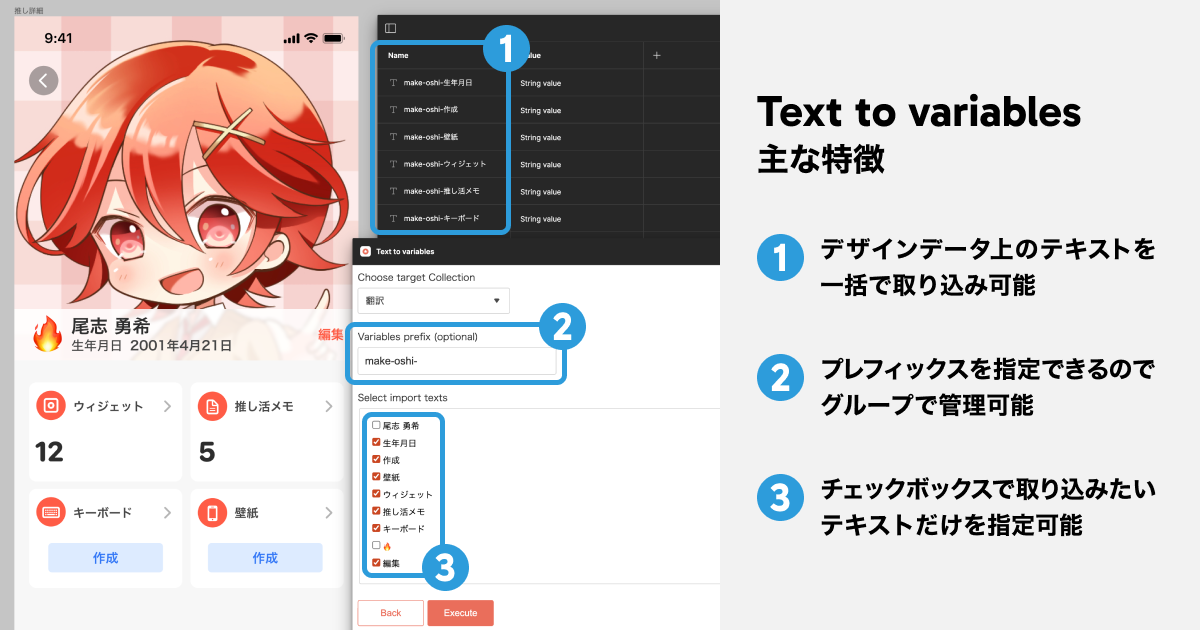 「Text to variables」は、スタイルからバリアブルに複数のテキストをインポート可能です。チェックボックスで指定したり、バリアブル名にプレフィックスを指定しグループ化することができます。翻訳や多言語管理などのタスクが簡単にできるプラグインです。