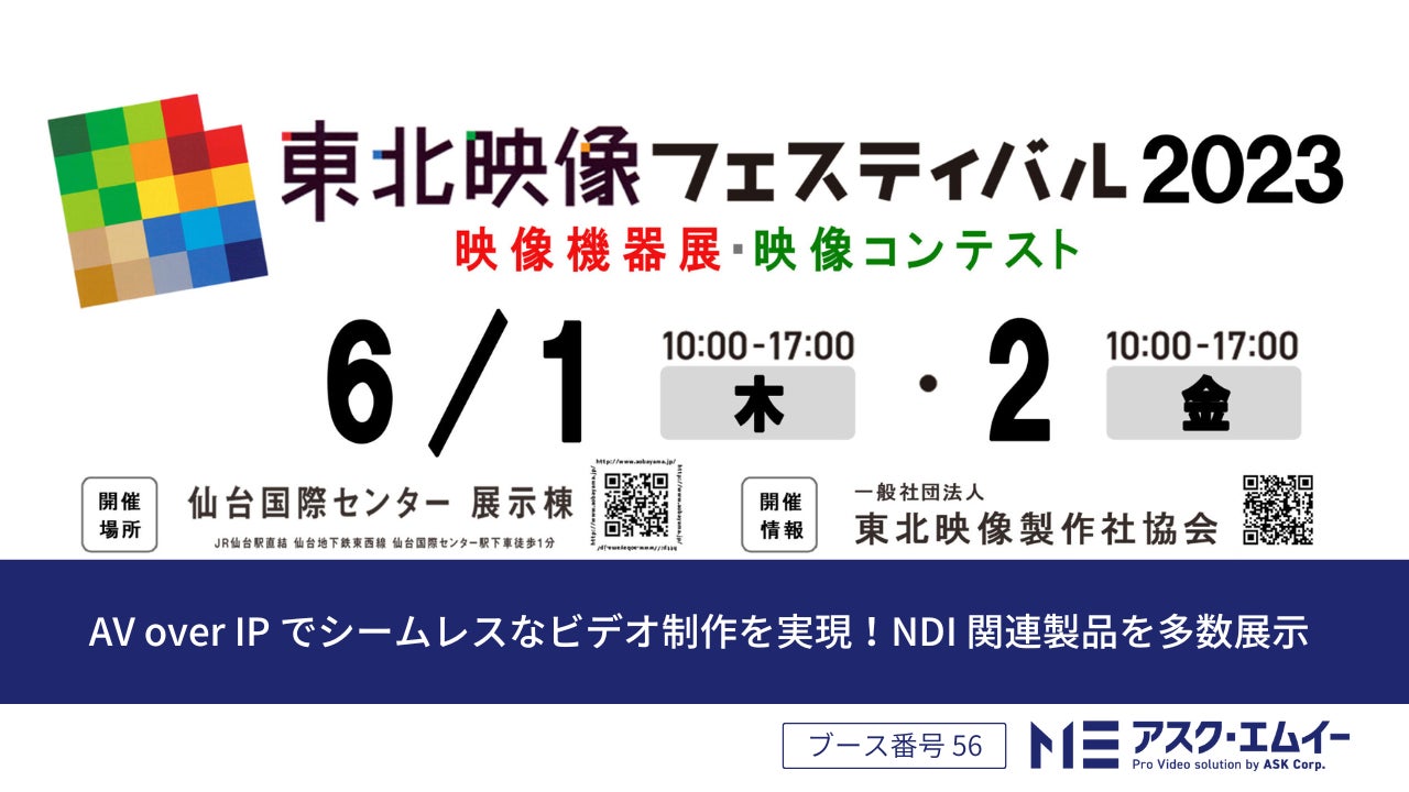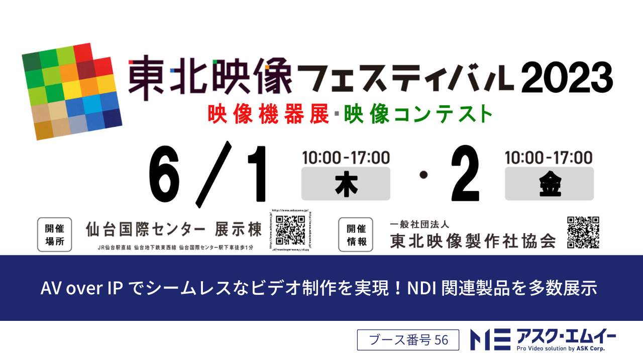 株式会社アスク ( 本社 : 東京都千代田区 ) は、 2023 年 6 月 1 日 ( 木 ) ・ 2 日 ( 金 ) に仙台国際センター展示棟にて開催される『東北映像フェスティバル 2023 』に出展します。アスク・エムイーの展示ブース ( 小間番号 : 56 ) では AV over IP の活用例をご提案、同社取り扱いの NDI / SRT など IP 規格に対応した製品の展示を行います。