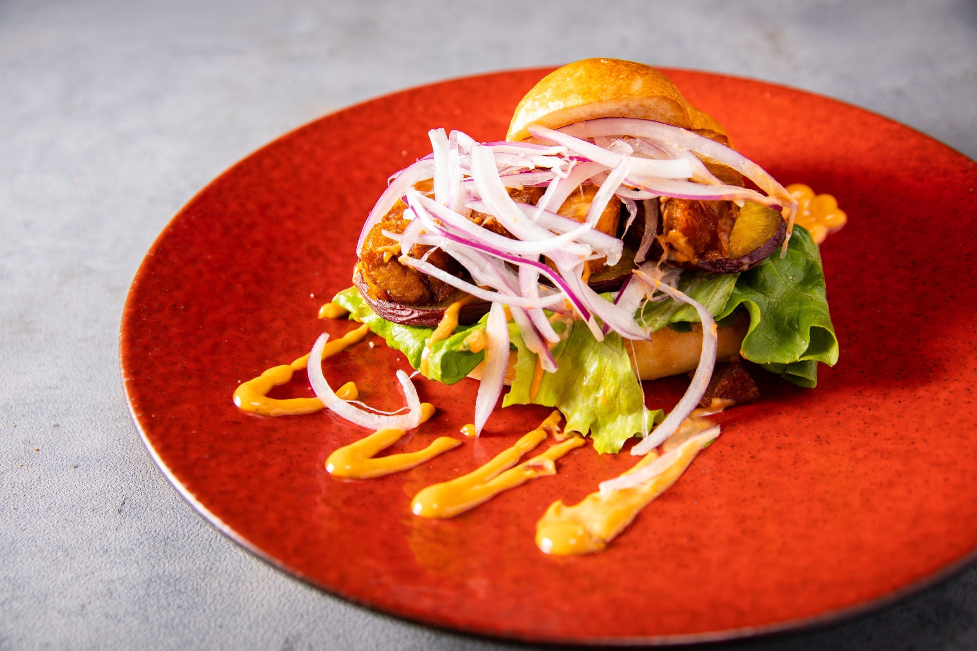 サツマイモのフライやタマネギのサラダをバンズで挟んだ