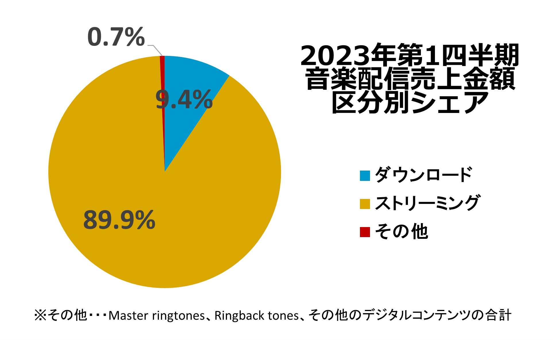 2023年第1四半期の音楽配信売上は前年同期比113%の283億900万円となりました。うち、ストリーミングは254億5,700万円と、音楽配信市場全体のほぼ9割にまでにシェアを拡大しています。