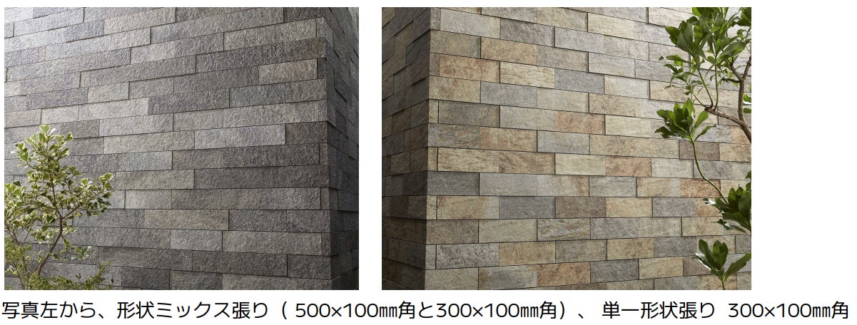 また合わせて、同シリーズの「ボーダーL」には、300×100角を追加します。500✕100角では納まりの悪かった柱型や門扉など、狭小部にも採用いただきやすくなりました。また、この2形状をミックスすることで、より複雑な石積みの表現が可能となっています。