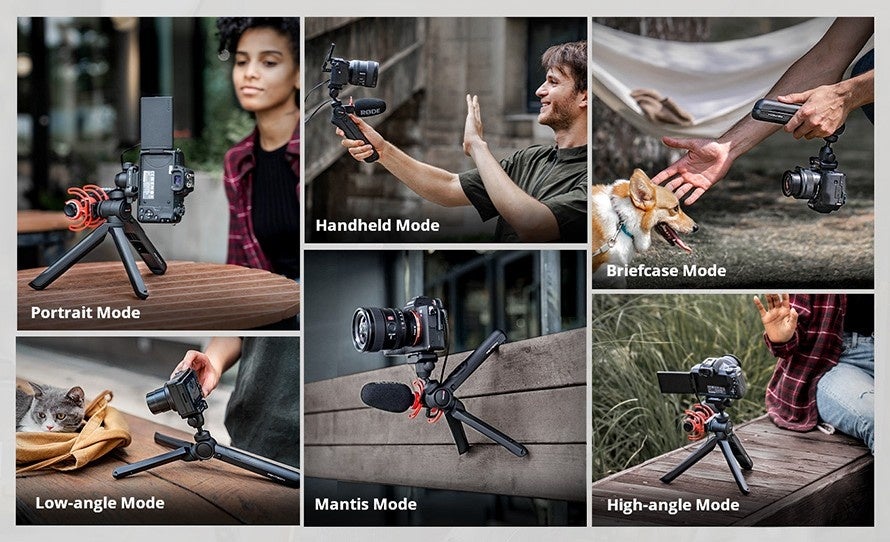 ミラーレス一眼カメラやスマートフォン、アクションカメラが搭載可能で、Vlogや自撮りをストレスなく楽しむための6つの撮影モードに対応した、折りたたみ式のコンパクトなミニ三脚です。軽くて高い耐久性の素材を使用し、最大2kgまでのミラーレス一眼や外付けマイクなどを搭載して撮影可能です。