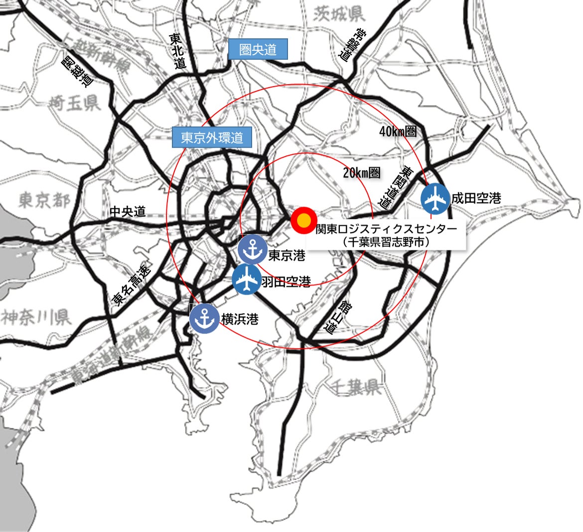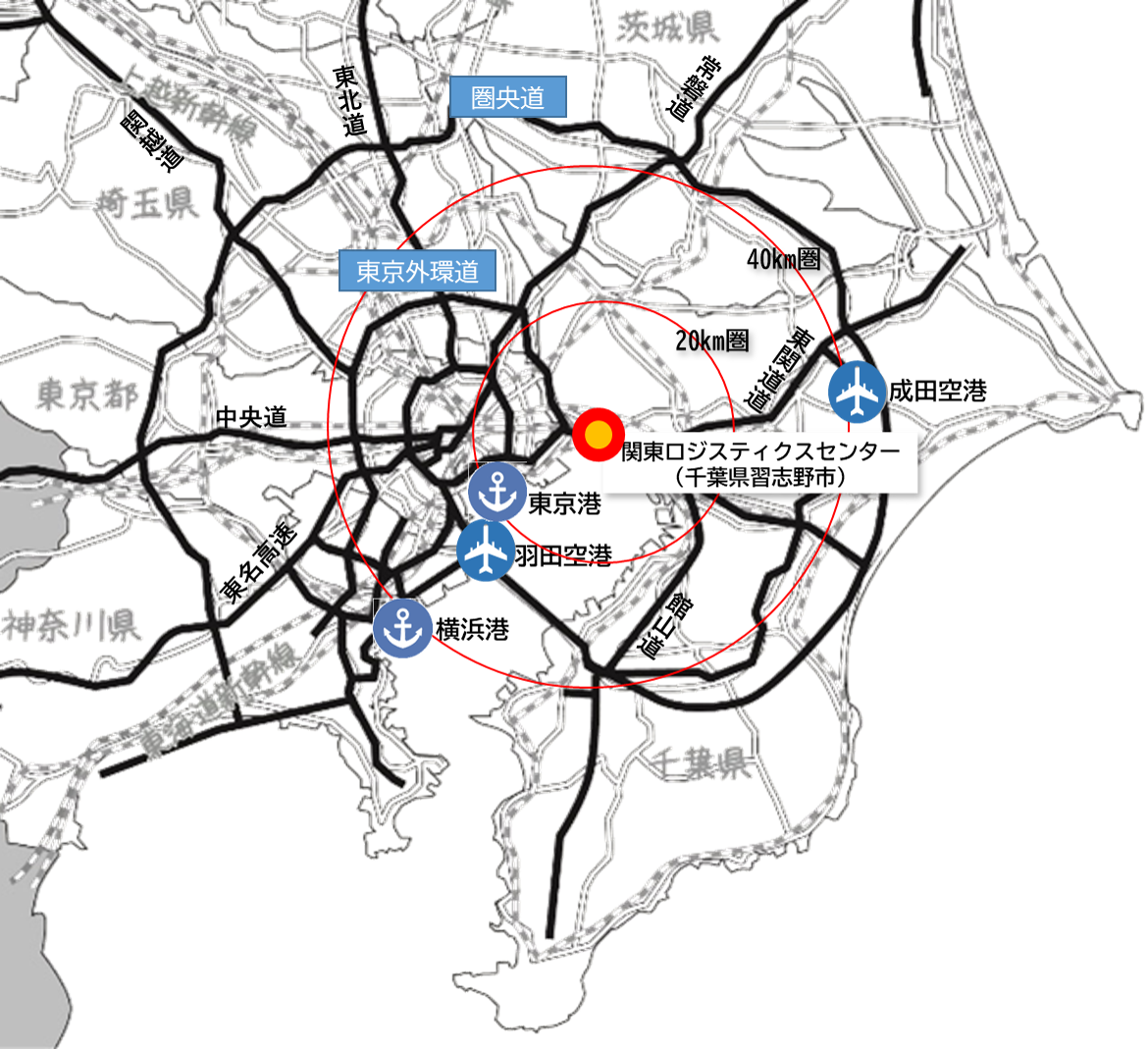にしてつ関東ロジスティクスセンターは、東関東自動車道 湾岸千葉ICから車で約7分の場所に位置し、関東域内の集配送にも便利なほか、羽田空港・成田空港・横浜港・東京港から40㎞圏内と、航空・海上輸送サービスの提供に適した立地にあります。当センターの延床面積は約20,000㎡で、当社国内物流拠点におけるフラッグシップと位置づけております。