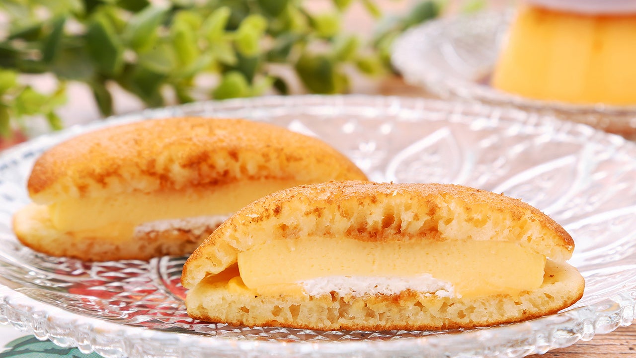 プリンを丸々入れて、ホイップクリーム、カスタードクリームをサンドしたもちもちとした洋風どら焼きです。