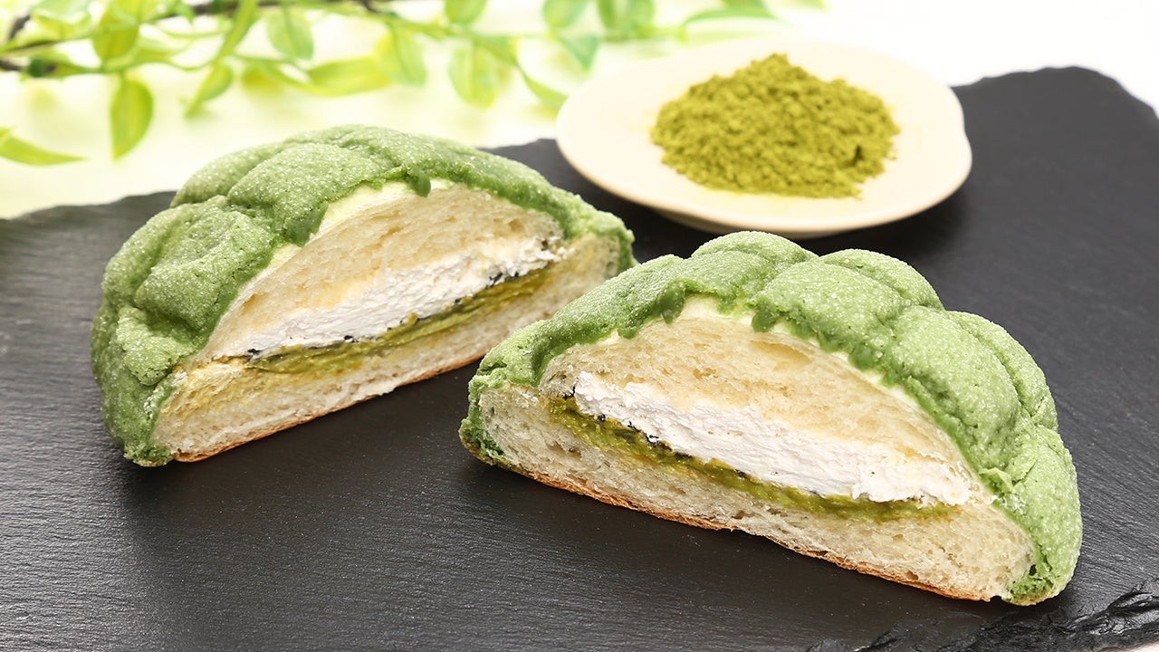 濃厚な宇治抹茶ペーストとホイップクリームをサンドした、抹茶風味豊かなメロンパンです。