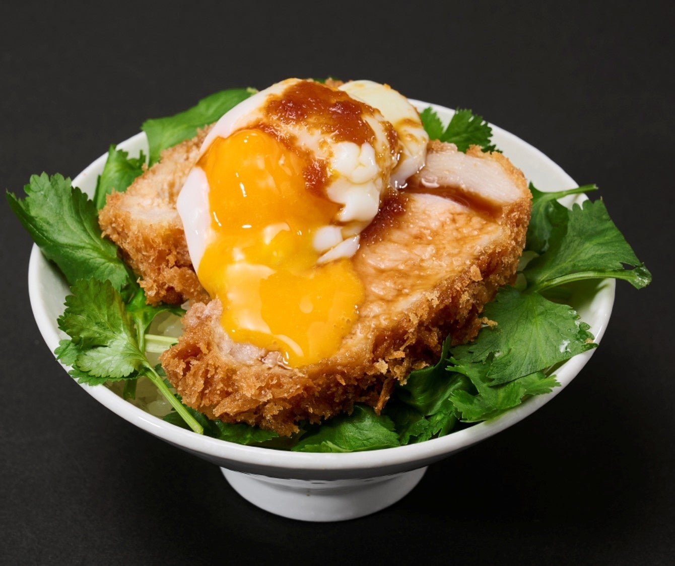 最後は、他店にはない唯一無二の極上「かつ丼スタイル」を、ぜひお楽しみください。ご飯の上に、とんかつ・パクチー・温玉を乗せ、ニンニク醤油ダレをかければ極上かつ丼の完成!