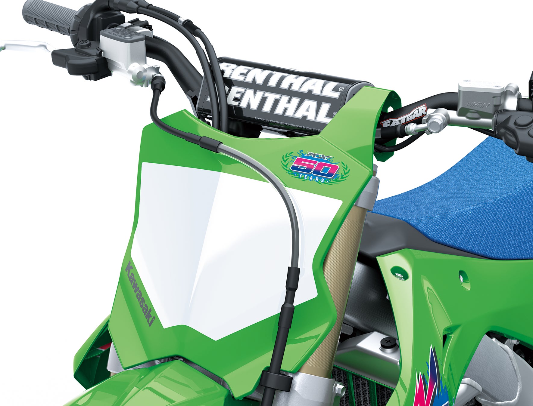 2023年で発売開始50周年を迎えるKXシリーズ。半世紀にわたる歴史を記念して、KXの持つアグレッシブさと挑戦する意思を具現化したアイコニックなモデルを新発売します。モチーフとなったのは、蛍光ピンクとブルーで構成されたKXロゴと鮮やかなブルーのシートを持った1990年モデルのKX250です。ポップでカラフルなデザインの走りとなったこのモデルは、多くのモトクロスファンの印象に残ったモトクロッサーといえるでしょう。車体には1990年モデルをオマージュしたKXロゴとシートのほかにも、1990年モデルをオマージュした多くのデザインや記念ロゴが盛り込まれており、KX50周年記念モデルとしてふさわしい外観を獲得しています。