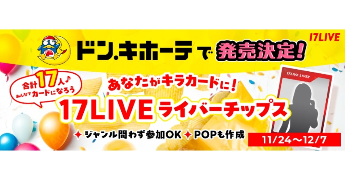 「17LIVEライバーチップス」の付録カードへの掲載を決めるオーディションイベント『ドン・キホーテで発売決定! あなたがキラカード! 17LIVEライバーチップス』を、本日2023年11月24日(金)より開催することが決定しましたので、お知らせいたします。