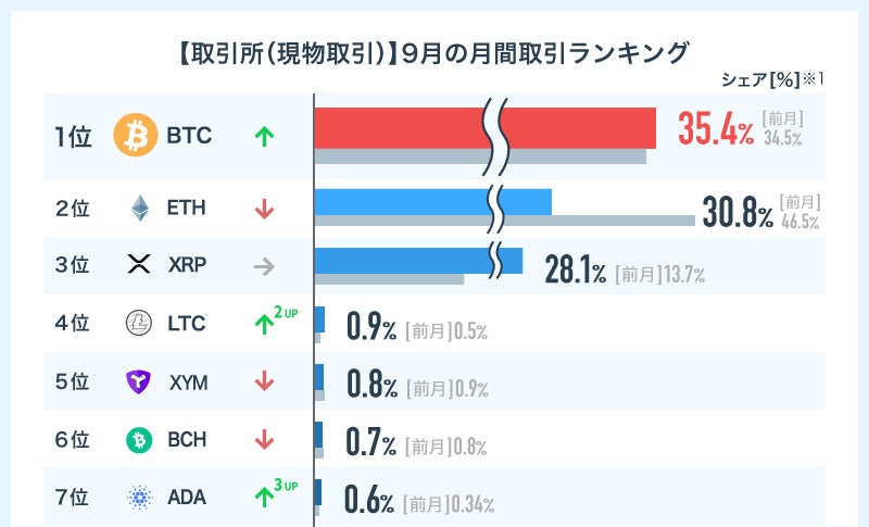 大型アップデート「The Merge」が終了したイーサリアム(ETH)のシェアが下がった一方で、販売所と同様にリップル(XRP)のシェアが伸びています。