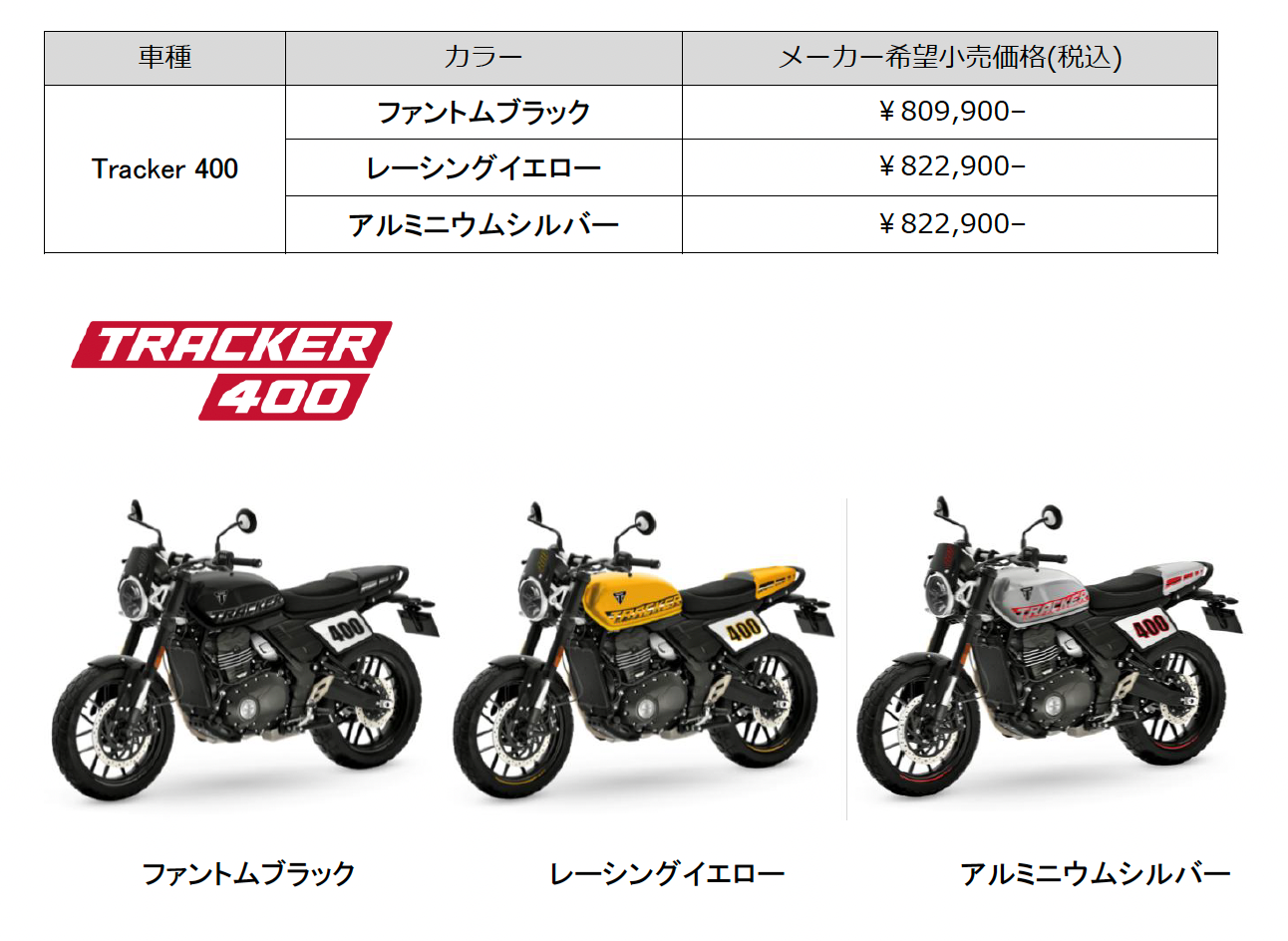 トライアンフモーターサイクルズジャパン株式会社(本社:東京都港区海岸 代表取締役社長:大貫陽介)は、2025年12月16日(火)より、現代のシーンにマッチしたトライアンフらしい性能と特性、単気筒のTRシリーズエンジンをベースに設計された400 ccモダンクラシックシリーズに、カフェレーサーというスタイルを生み出し、その伝統を継承する「Thruxton 400」と、大胆に削ぎ落としたスタイルとフラットトラックレーサーのスピリット、レースをルーツとするグラフィックを纏った唯一無二の存在感を放つ「Tracker 400」を発表いたします。