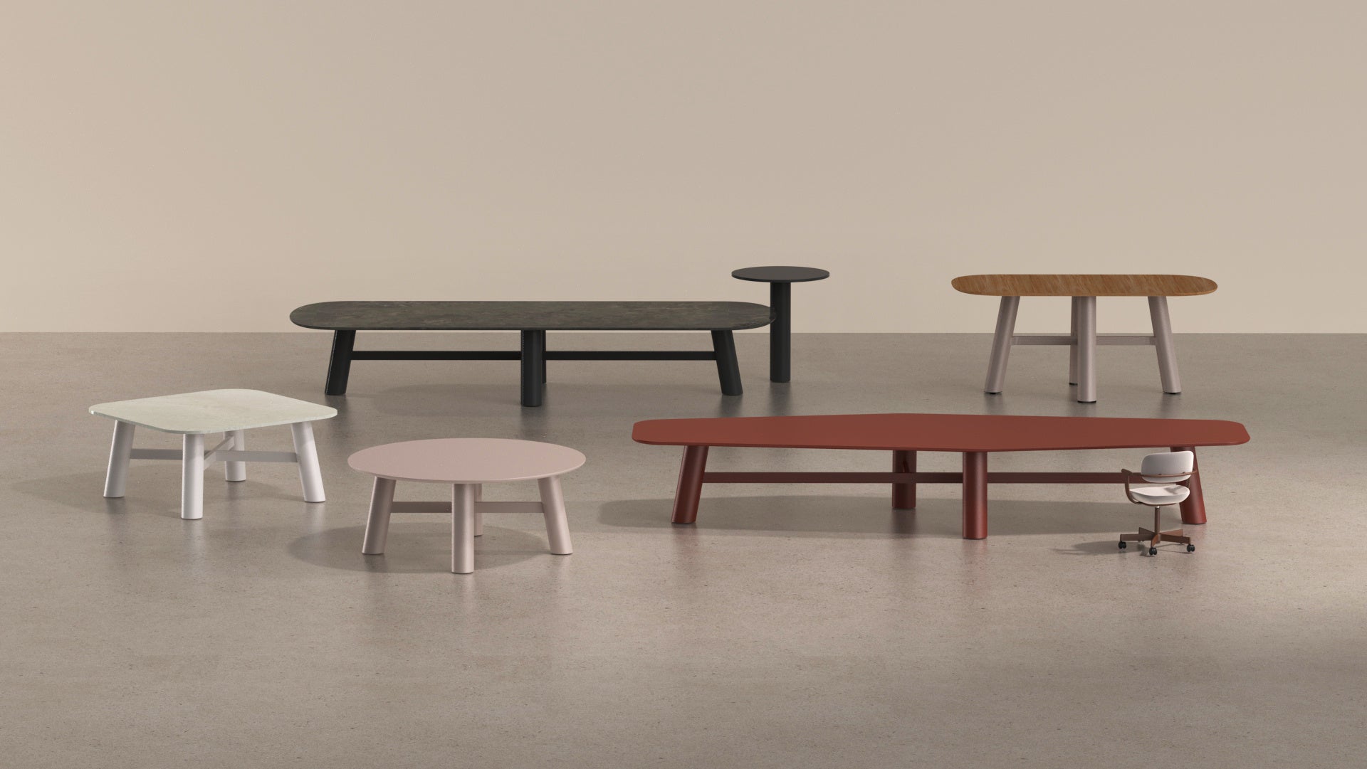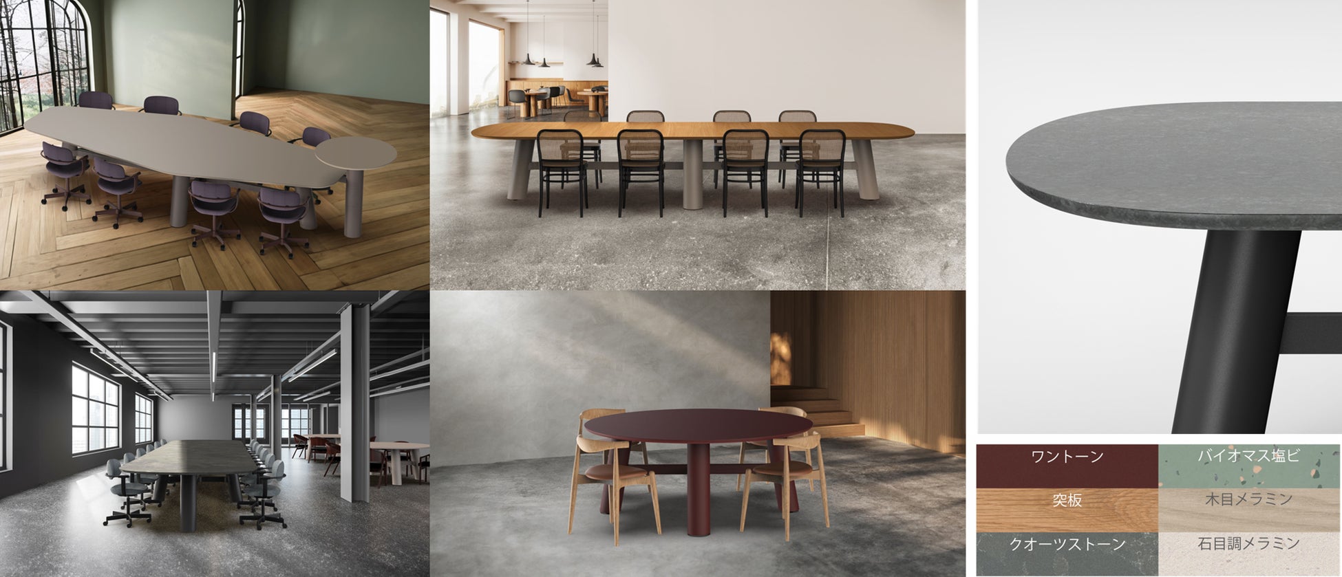 人が自然と集まり、思い思いに過ごしたくなるような柔らかさとボリューム感を備えた意匠、佇まいを目指しました。 また、空間に調和しながら、彩りを生み出すような多様な天板素材を取り入れています。天板と脚を同色で仕上げたワントーンのスタイルや、突板仕様、新素材として天然鉱物を使用したクオーツストーンやサステナブル素材で柄感のあるバイオマス塩ビのほか、石目調メラミンや木目調メラミンからお選びいただけます。