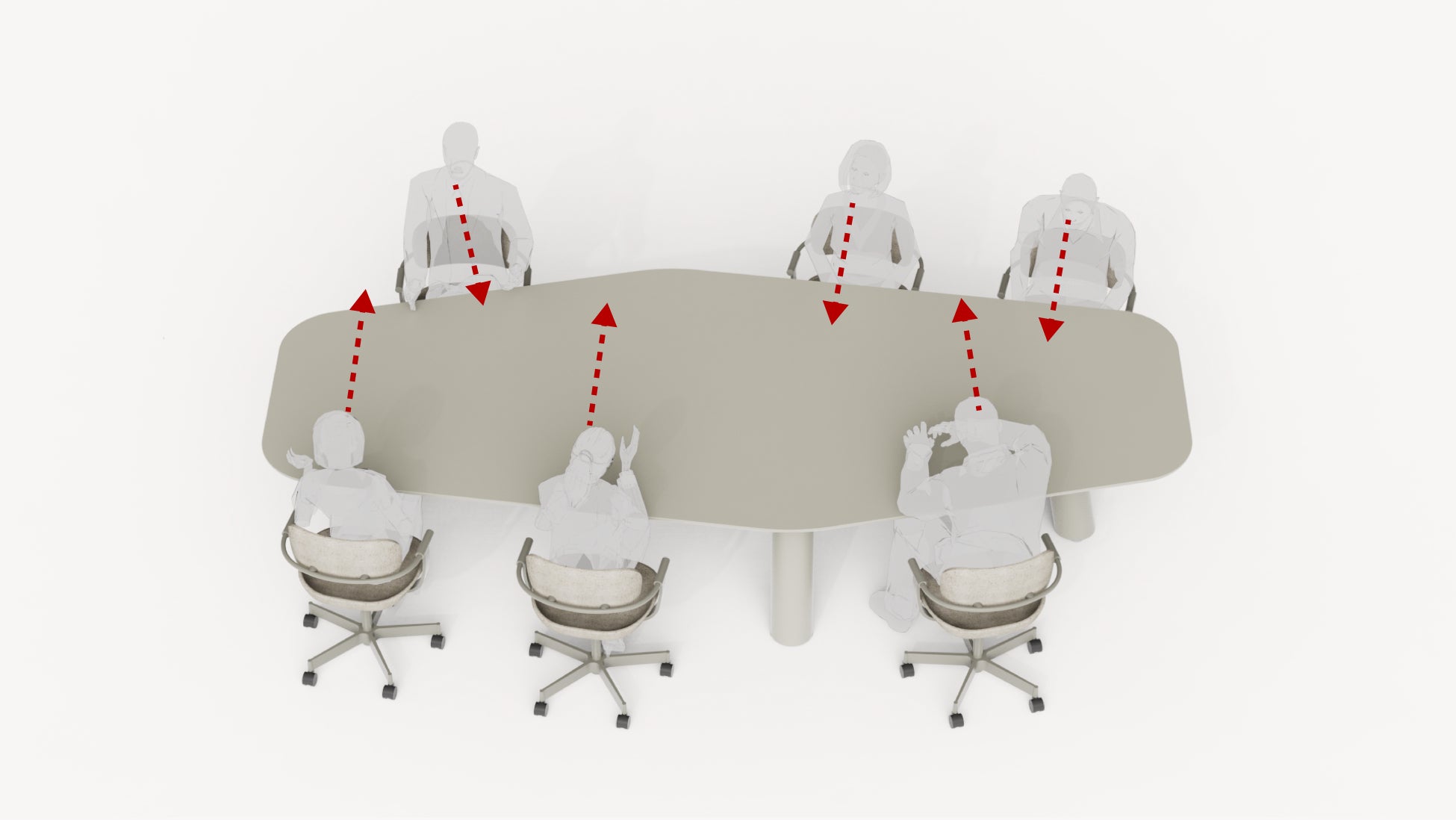 本製品の代表機種である「異形」の天板は、座る位置で視線の向きや距離が変化します。個人席として使用するシーンでは、端の席は距離が近くて話しやすく、中央席は距離がとれるというように、各々好みの場所を選択できます。また、視線が中央に集まりやすくチーム席にも適しています。 視線は周囲にも広がるので通りがかりの会話も生まれやすくなります。「両アール形」の天板は、向いの席とのゆったりした距離感が程よい形状で、ゆるやかに周囲とのつながりを感じながらの執務が可能です。「円形・正方形」の天板は、ゆとりのある広さで多用途に対応し、個人席としてもミーティング席としても快適に使用できます。
