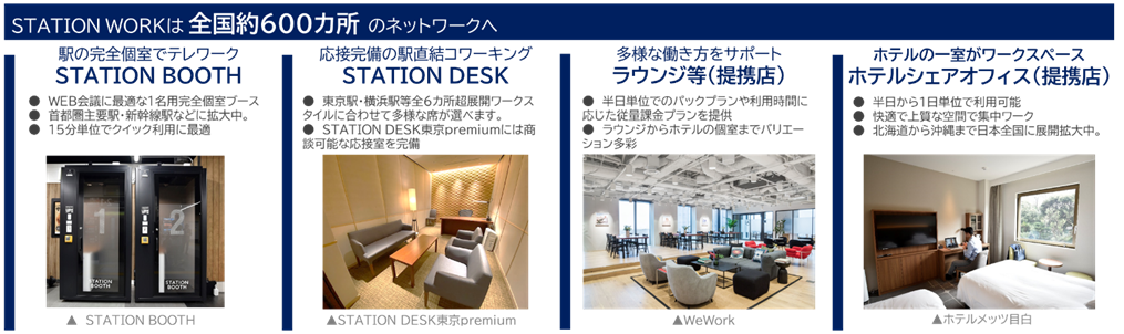2019年8月に開業したJR東日本のシェアオフィス STATION WORK は、「働く人の“1秒”を大切に」を事業コンセプトに多様な働き方をサポートしており、今回の「STATION DESK東京丸の内」のリニューアルオープン時点で、全国約600カ所のネットワークとなります。駅の便利なワーキングブースSTATION BOOTHはもちろん、WeWorkなどのラウンジやホテルシェアオフィスといった各種アライアンスを強化していきます。2023年度1,000カ所体制に向けて、今後もスピーディーに拠点拡大を進めます。