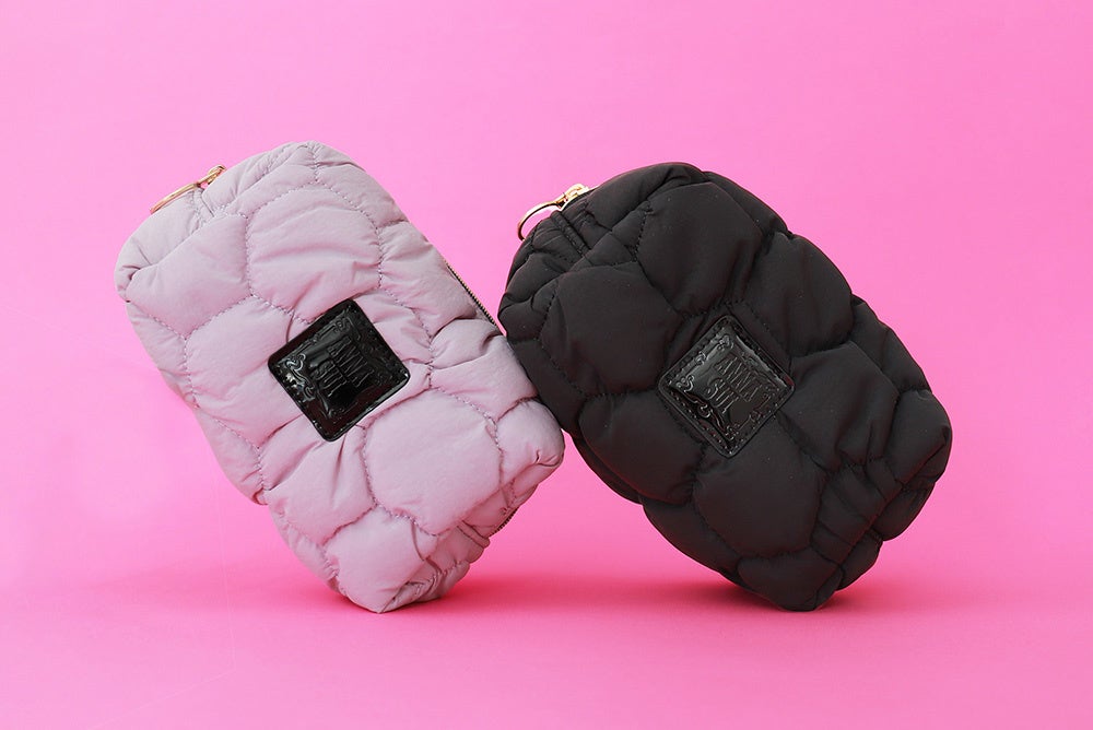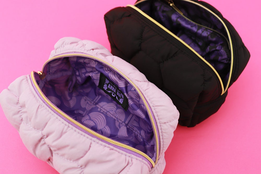 ぷくぷくとしたキルティングが愛らしいポーチ。ファスナー付きポケットや仕切りポケットを備え、機能性も充実。裏地の柄にはコレクションのアーカイブから柄「RIBBED ROSES」をセレクト。 開けた瞬間にも心躍る、細部にまでこだわったデザインに仕上げました。
