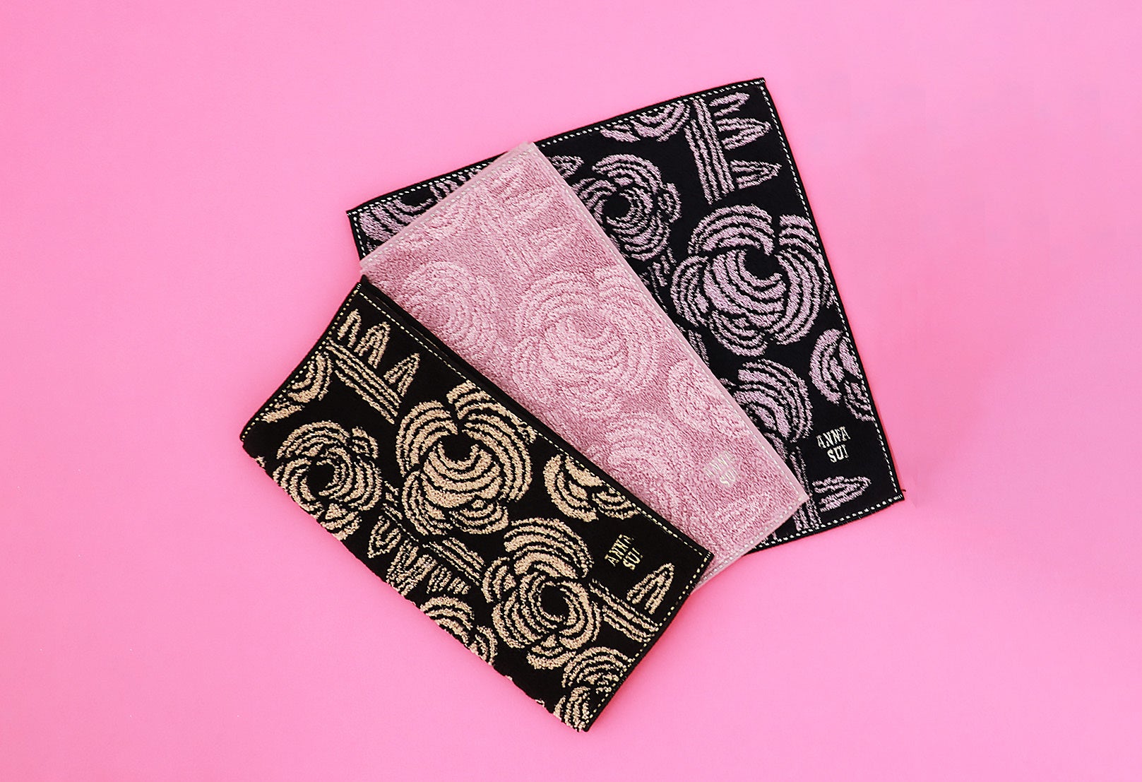 約28cmの大判サイズで、手を拭くのはもちろん、ひざの上に広げたり、小物を軽く包んだりと、幅広いシーンで活躍します。「Bubbles」シリーズのポーチやミニトートの裏地とお揃いのアーカイブ柄を使用。大胆なローズが印象的な、ANNA SUIらしい1枚です。