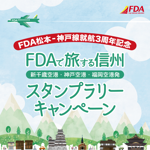 株式会社フジドリームエアラインズ(略称:FDA、本社:静岡県静岡市、代表取締役社長:楠瀬 俊一)は、松本=神戸線の就航3周年を記念して「FDAで旅する信州 スタンプラリーキャンペーン」を実施しております。