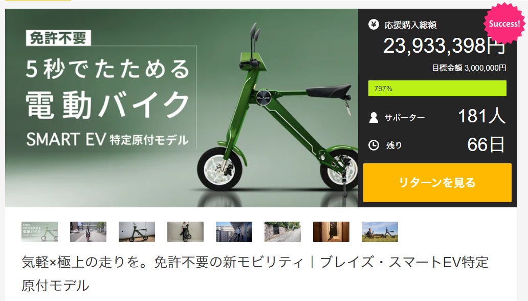 先日スタートしたMakuake応援購入プロジェクトでは、開始初日に1位を獲得した「16歳以上免許不要」の新商品:スマートEV 特定原付モデルをはじめとした、電動キックボードや電動バイク、宅配ビジネスに最適:EVデリバリー(3輪)、ジープタイプの電動ミニカー:ネクストクルーザーEV(4輪)等、弊社電動モビリティのラインアップをご準備いたします。