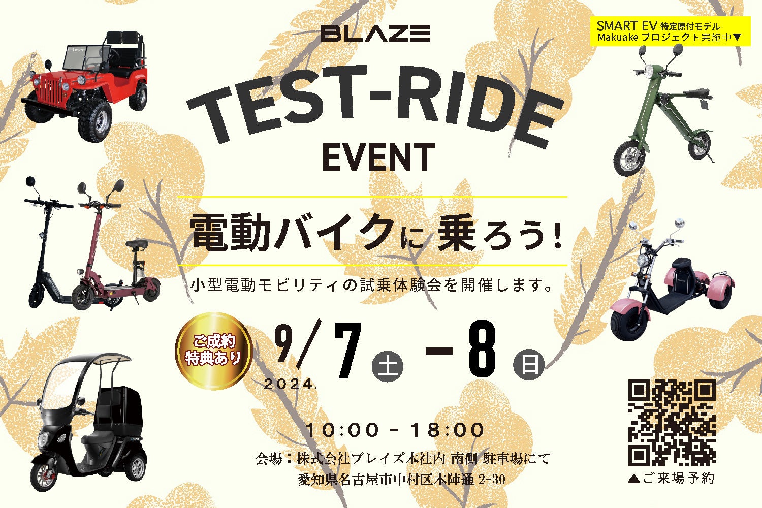 株式会社ブレイズ(愛知県名古屋市、代表取締役:市川秀幸、以下ブレイズ)は、2024年9⽉7⽇(土)・8日(日)に、ブレイズ名古屋本社にて、新商品「スマートEV 特定原付モデル」をはじめとする弊社の小型電動モビリティ商品の試乗会および展示車両即売会を開催いたします。