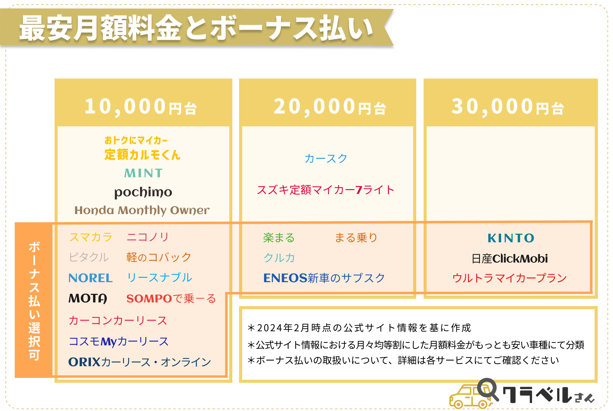 カーリース・車のサブスク各社の最安の月額料金は、取扱車種や契約可能年数、月額料金に含まれる費用、残価の取扱いなど、さまざまな要素で変わってきます。また、ボーナス払いについても、利用できるサービスとできないサービスがあります。